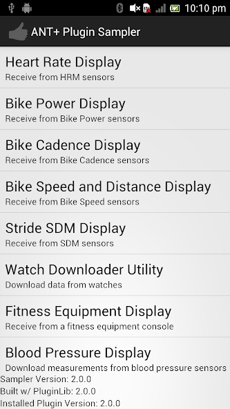 The ANT+ Plugin Sampler allows interaction with all the ANT+ devices supported by the ANT+ Plugins. It is intended as a testing tool and reference code, so it is not extremely pretty and will not be very nice for general purpose use. Source code is available in our ANT+ Android SDK at http://www.thisisant.com/developer/ant/ant-in-android/.