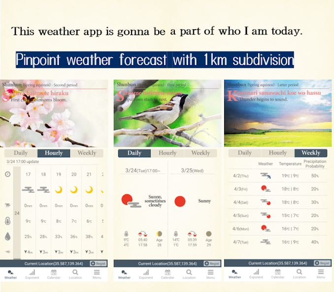 "Sora Koyomi" is an application that enriches your life by adding the information of the Japanese lunar calendar "72 seasons" to highly accurate weather forecasts and enjoying the daily weather with the detailed expressions of the seasons.