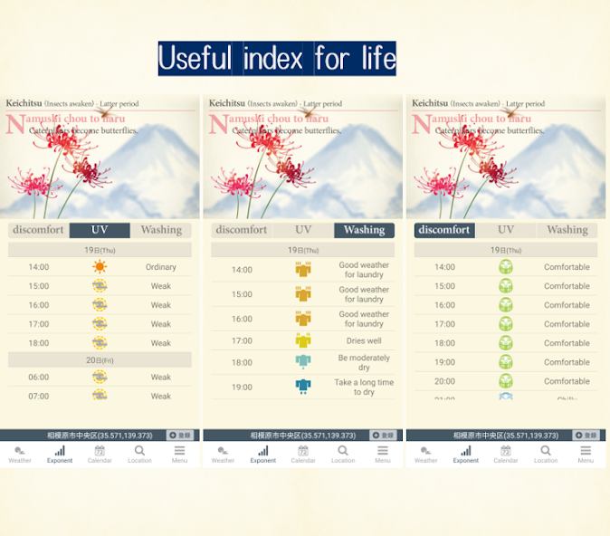 Indexes for laundry, UV rays, and more, analyzed by our proprietary algorithms. We hope you find it useful for your daily life.