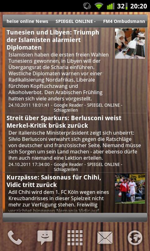 ** Advice 2: if no news are shown, probably the used launchers doesn't support scrollable widgets. Please try LauncherPro, ADW.Launcher, Zeamlauncher or such, activate scrollable support und try again. Thanks! - In Android >3.0 the original launcher should work.