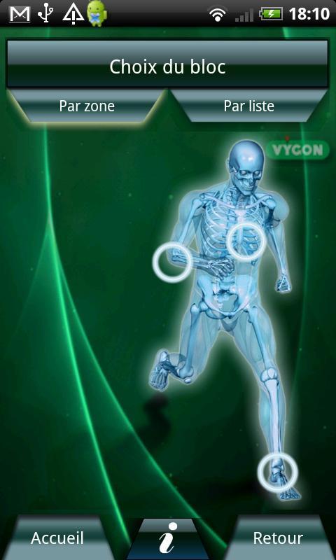 The choice of location to the upper or lower limb and the trunk is done either by zone or by list and gives access to an almost exhaustive list of the blocks.