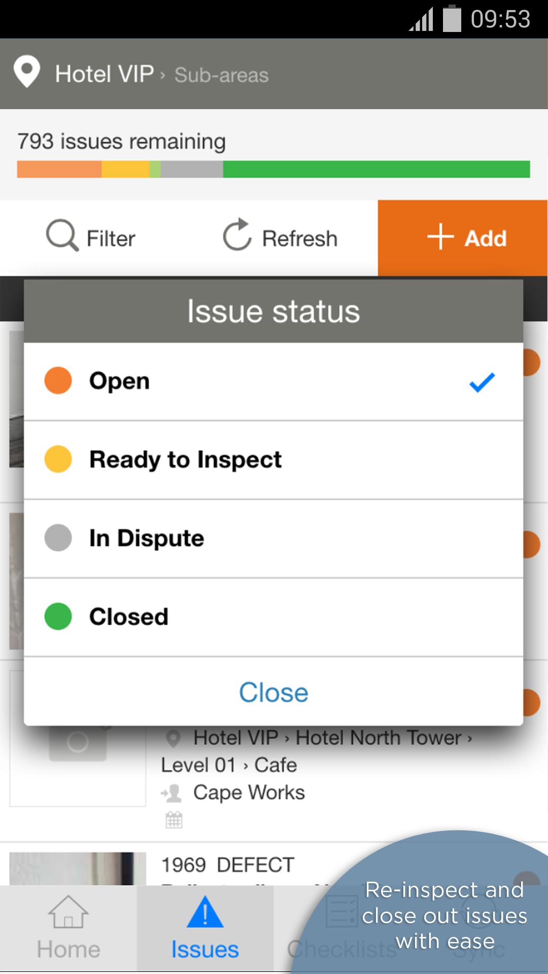 * Reinspection: Reinspect and close out issues with ease. Accept or reject issues, or edit issues that require further fixing in the field.
