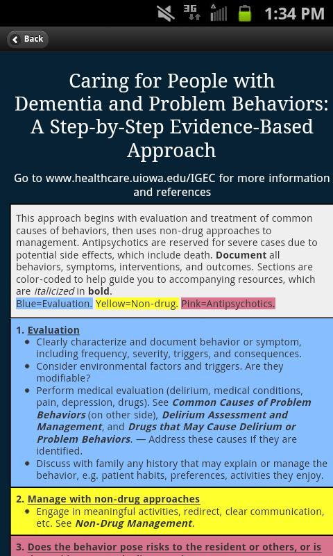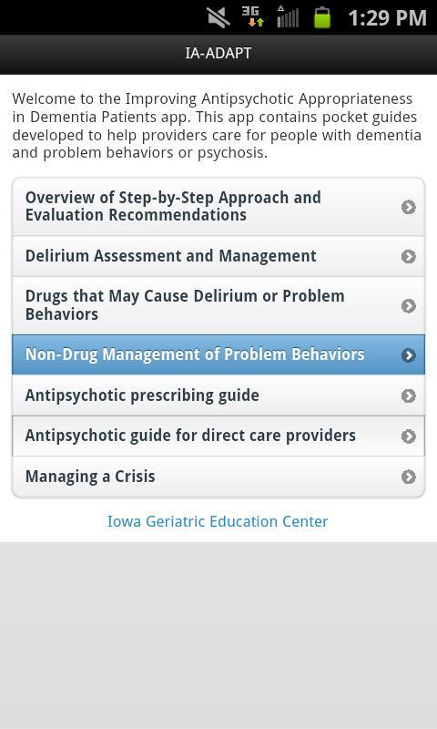 Quick clinical reference guides on managing problem behaviors and psychosis in dementia. Provides information on non-drug management, delirium screening, medication review, and appropriate antipsychotic use and monitoring. Product of an AHRQ funded grant, Improving Antipsychotic Appropriateness in Dementia Patients. Developed by University of Iowa investigators, the Iowa Geriatric Education Center, Health Literacy Iowa, and PMC Studios, with the assistance of many health care providers who reviewed the content.