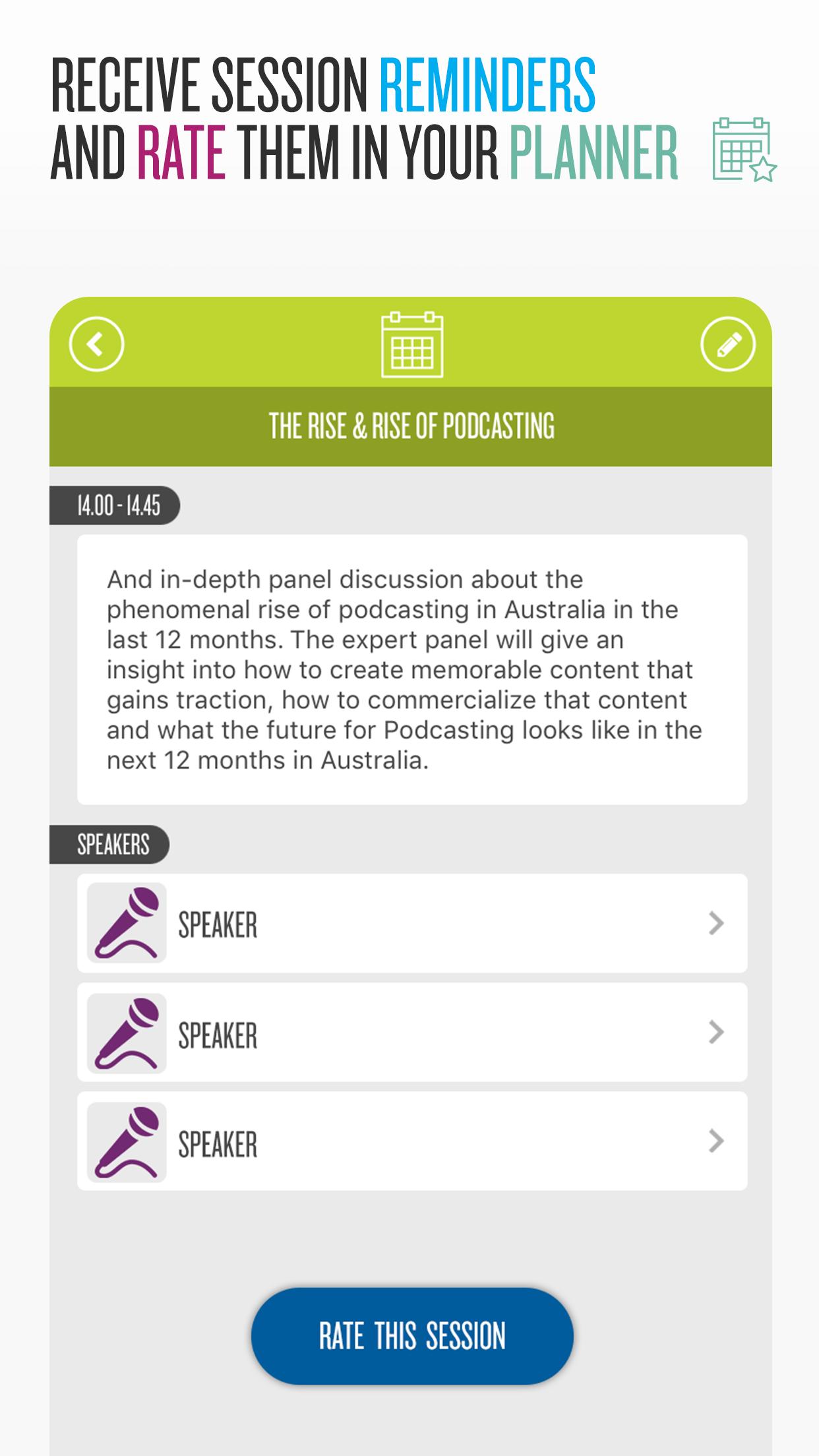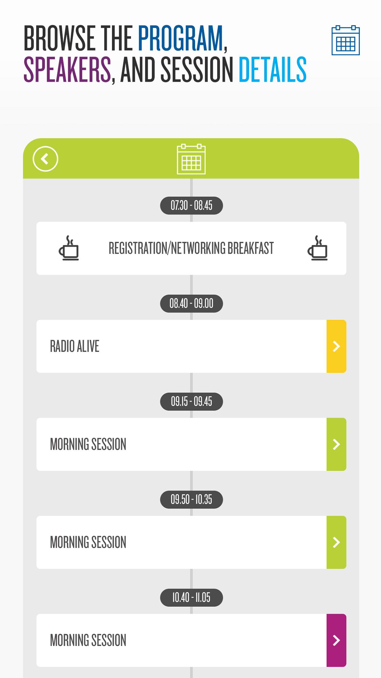 - Browse the PROGRAM or SPEAKERS, and add sessions to your PLANNER