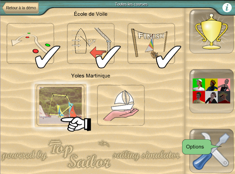 Yoles Martinique is a video game that simulates a yole race on the waters of the island of Martinique. This game is based on the Top Sailor sailing simulator that is available as a separate game.