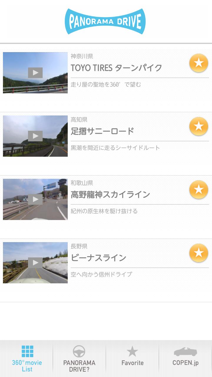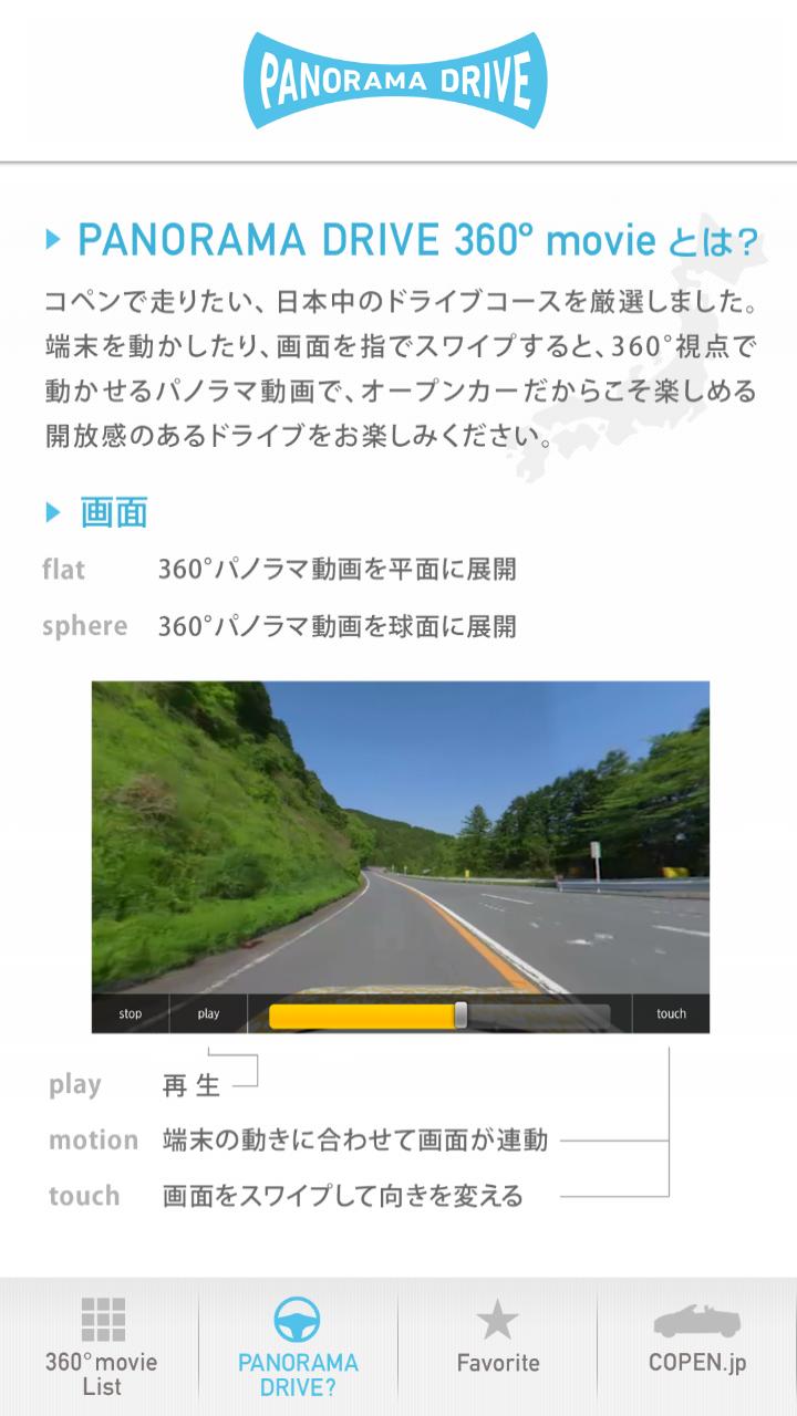 We have carefully selected driving courses all over Japan that you would want to ride in Copen. Enjoy an open-minded driving experience that is only possible in a convertible car with panoramic videos that allow you to move your device or swipe the screen with your fingers.