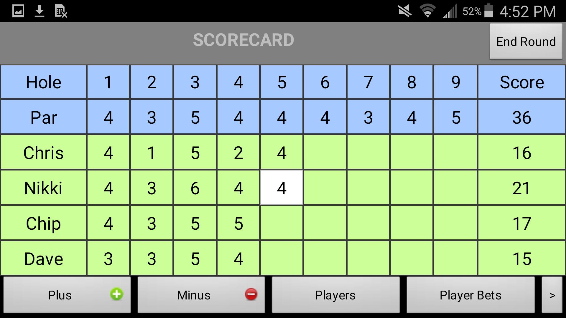 - Auto-populates par for each hole and allows you to simply add or subtract from par