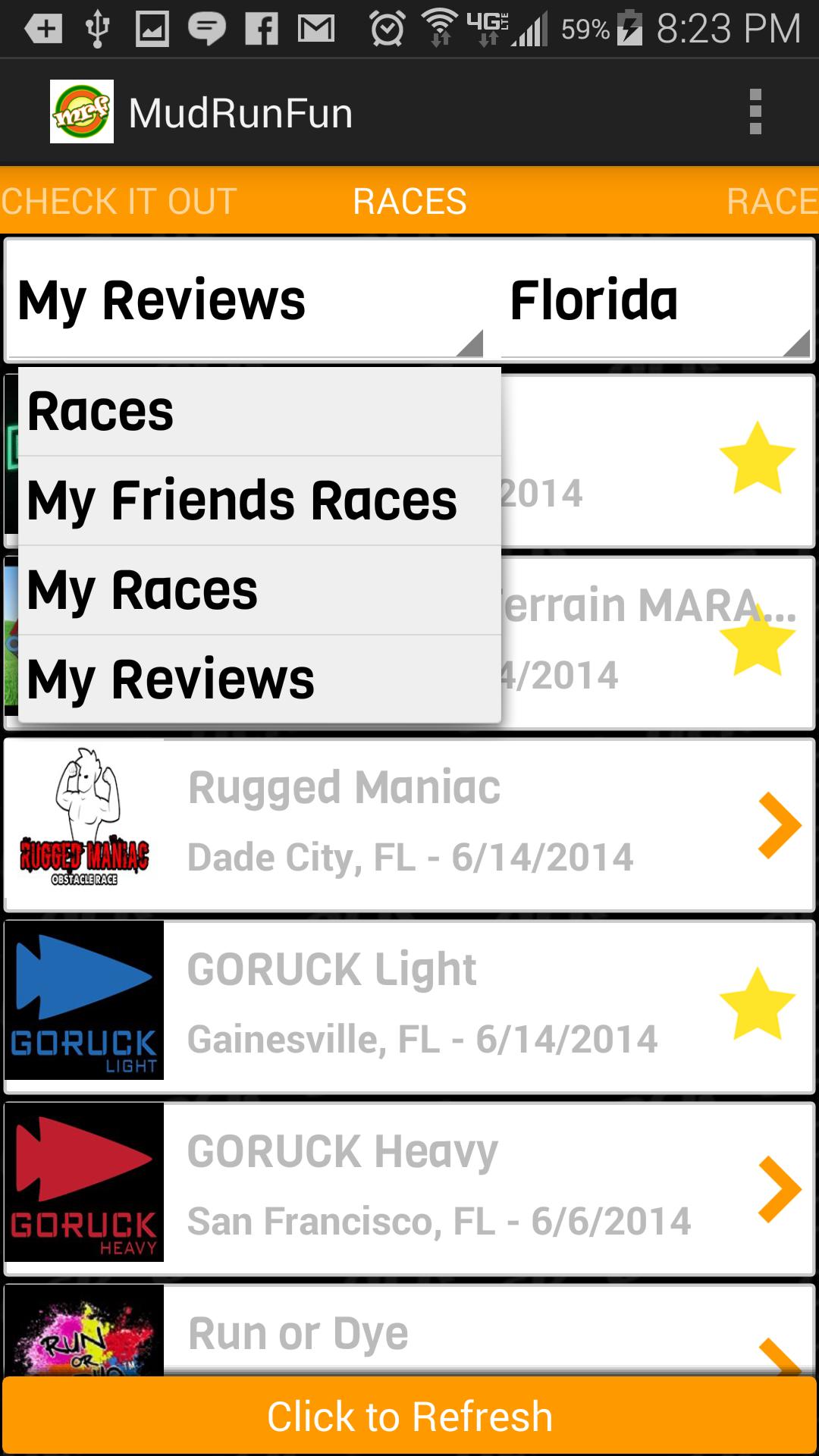 Mud Run Fun app lists the race and obstacle course data from mudrunfun.com . We show you upcoming races, MRF promo codes and connect with the MRF facebook app so you can let your friends know which race your attending.