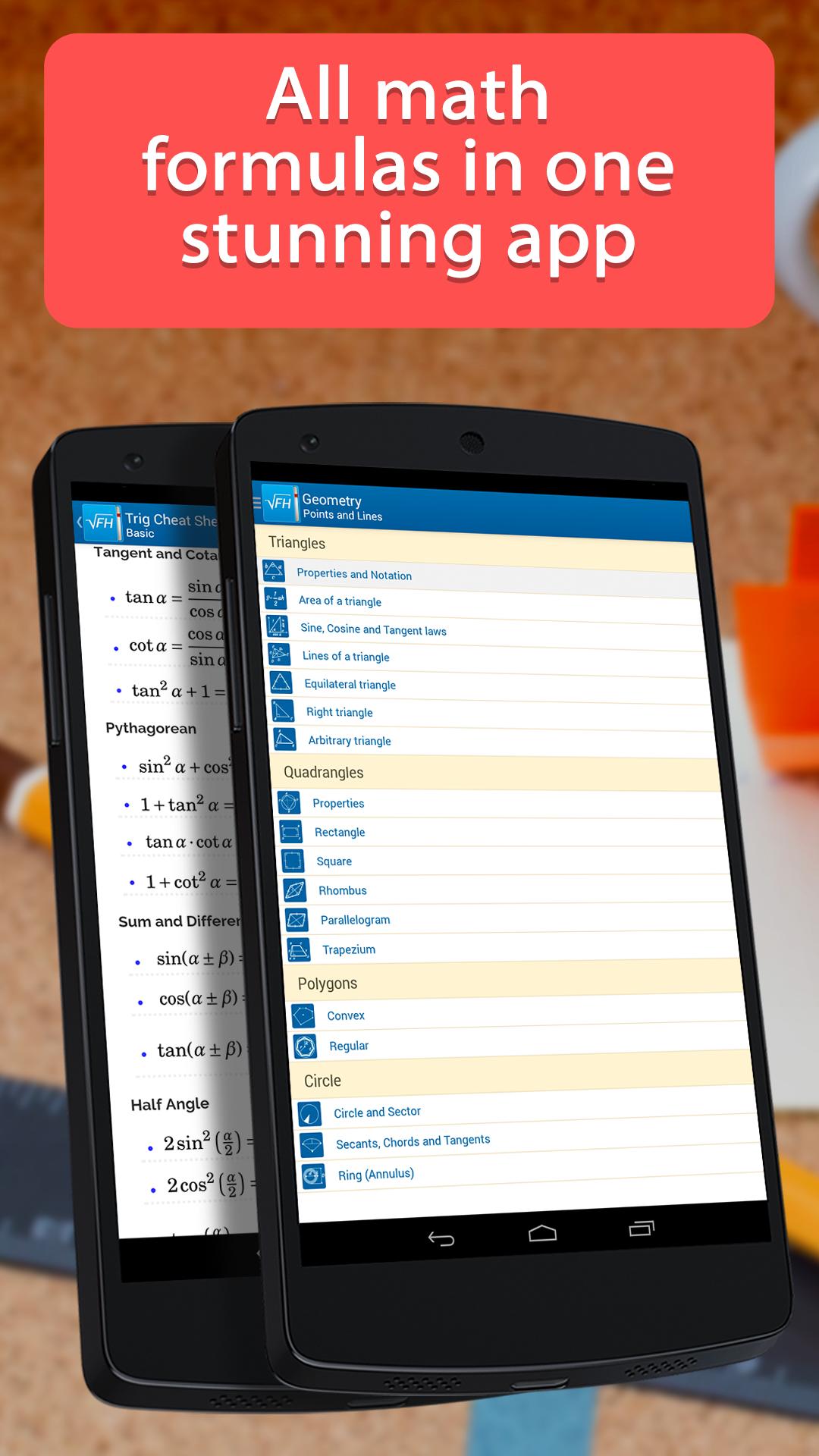 This mathematical formulae app Free is useful to quick solve homework, quiz, test, studying, or ref. It can be used for studying pre calculus, calculus, learn algebra, trigonometry, solve trigonometric equation, geometry shapes, studying function, sequences, and more content that is mathematical. Also can be used as picture mathematical homework ref.