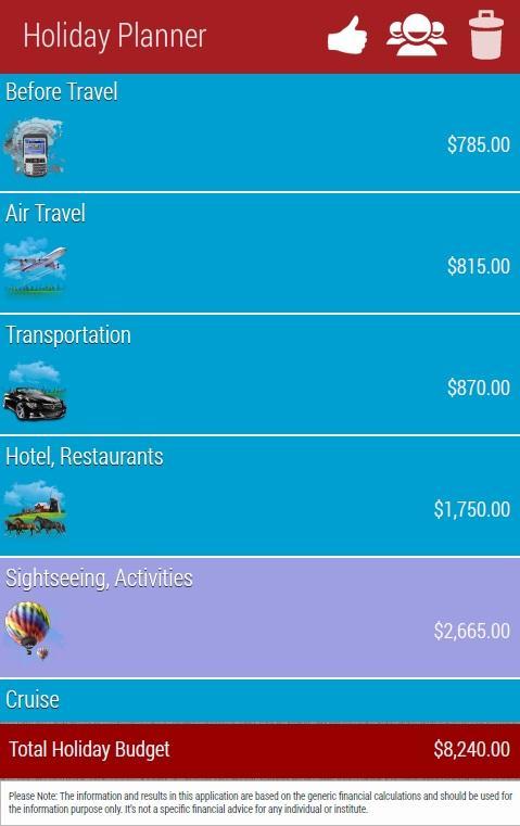 Holiday Budget Planner is a lightweight tool for planning, managing the holidays with custom budget. It allows you to plan the activities pre and post travel in sequence of events that occurs generally on vacations.