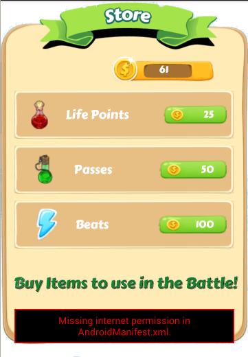 Buy Life Points potions, passes potions and beats items to help you win the levels.