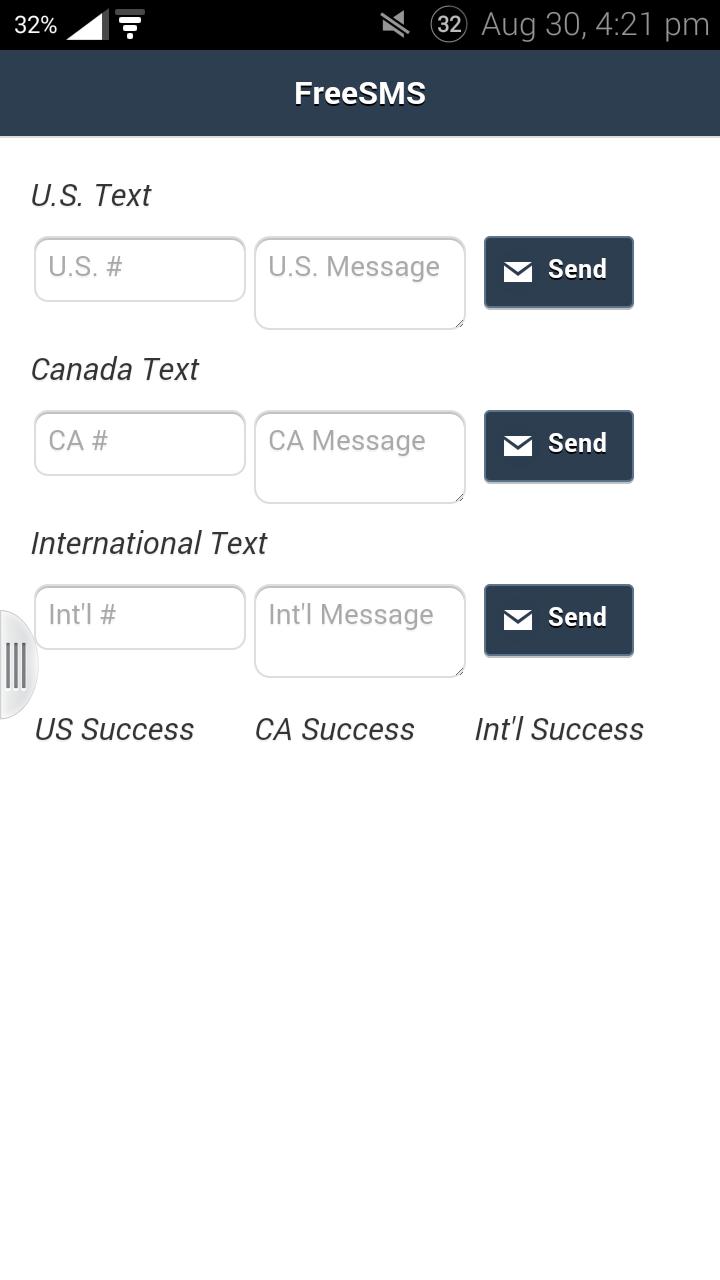 Send a Free SMS with this app! It uses the internet to connect to an API to send the texts for free, including to U.S. Canadian, and International numbers! Send text messages to any supported carriers for free and not be out of touch with anyone, no matter what country they live in!