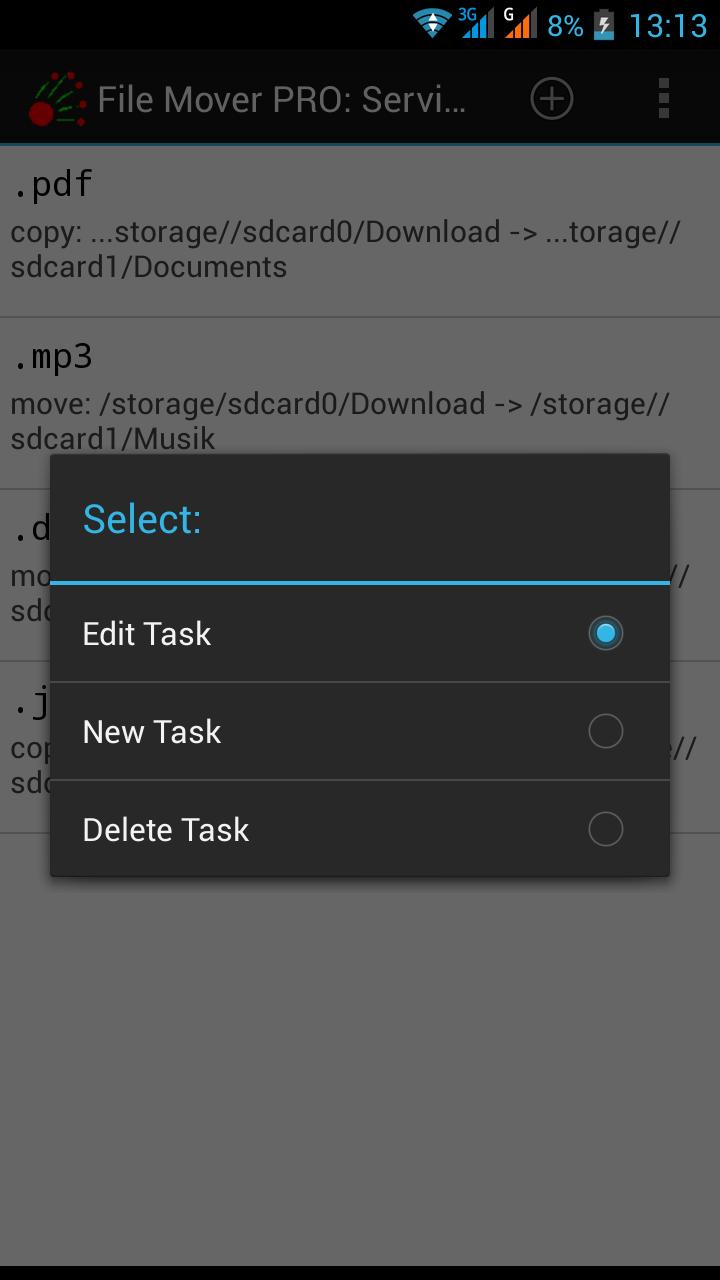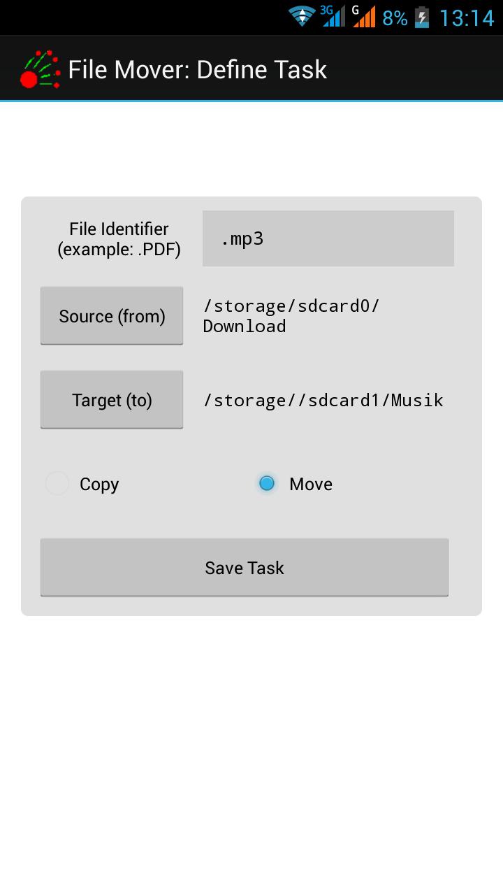 For example, .MP3 files from /sdcard/download to /sdcard/music. And .PDF Files from /sdcard/external_sd/office to /sdcard/Documents...
