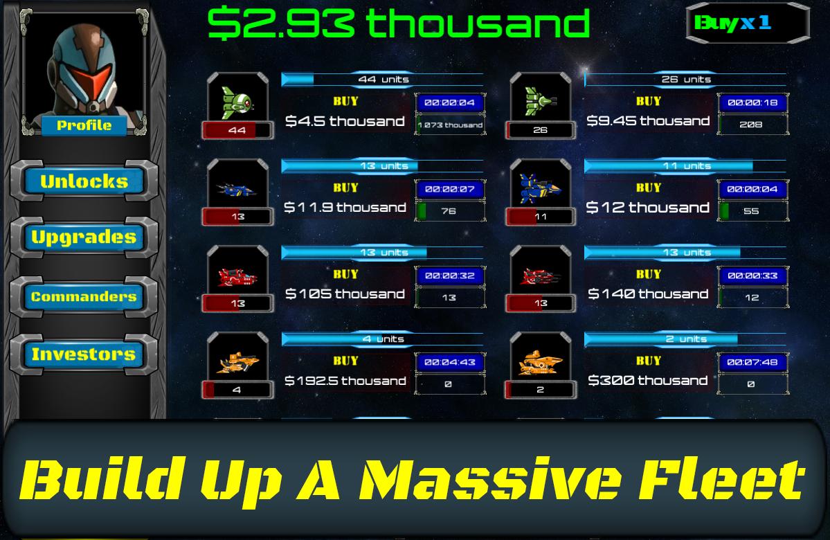 The Galaxy is at war! It is an excellent opportunity to start your own mercenary corporation and build up a massive fleet to rake in massive amounts of credits from your clients and investors. Purchase factories to mass produce your fleet's ships and take them to battle against never-ending waves of enemy fleets.
