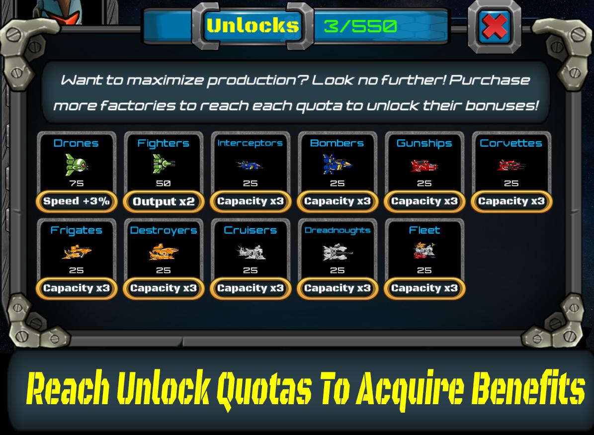 - Complete Unlock targets and purchase Upgrades to acquire production and fleet bonuses.