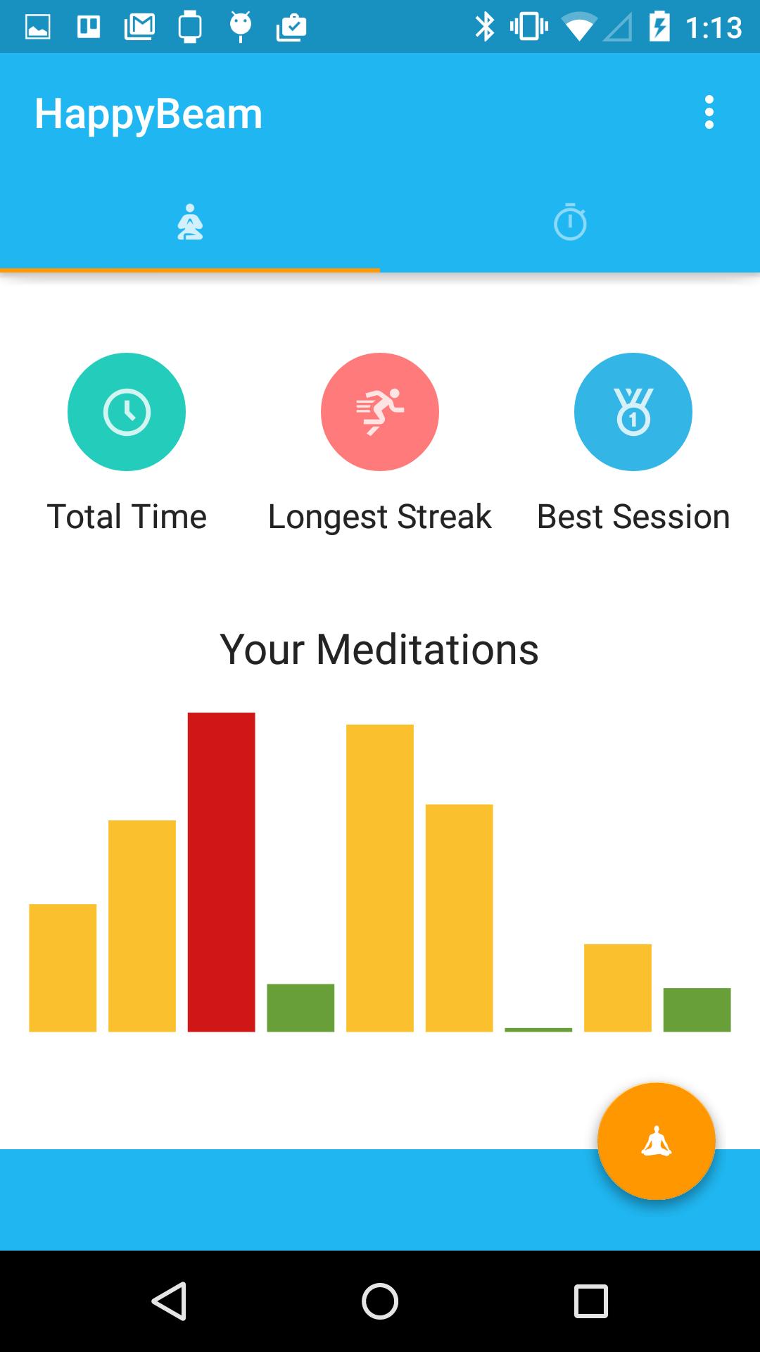 HappyBeam runs alongside meditation apps to measure how a user moves during a meditation. The app calculates a movement score using a cutting-edge algorithm. Happy-peaceful scores are marked green, not-so-good scores are yellow, high-anxiety scores are red.