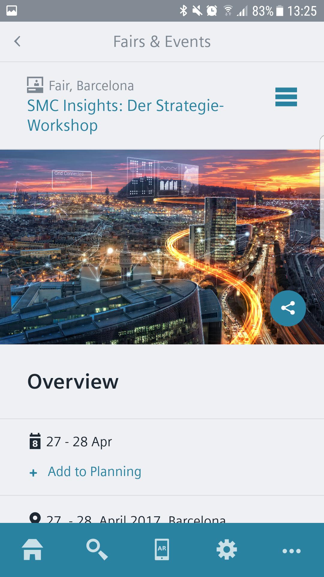 Siemens Fairs & Events is your personal guide to Siemens’ activities at selected events providing fast access to all relevant event information via a new and improved user interface. It makes this application the ideal companion for your visit at every event with Siemens participation.