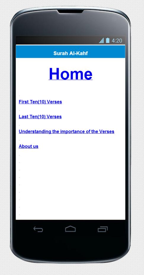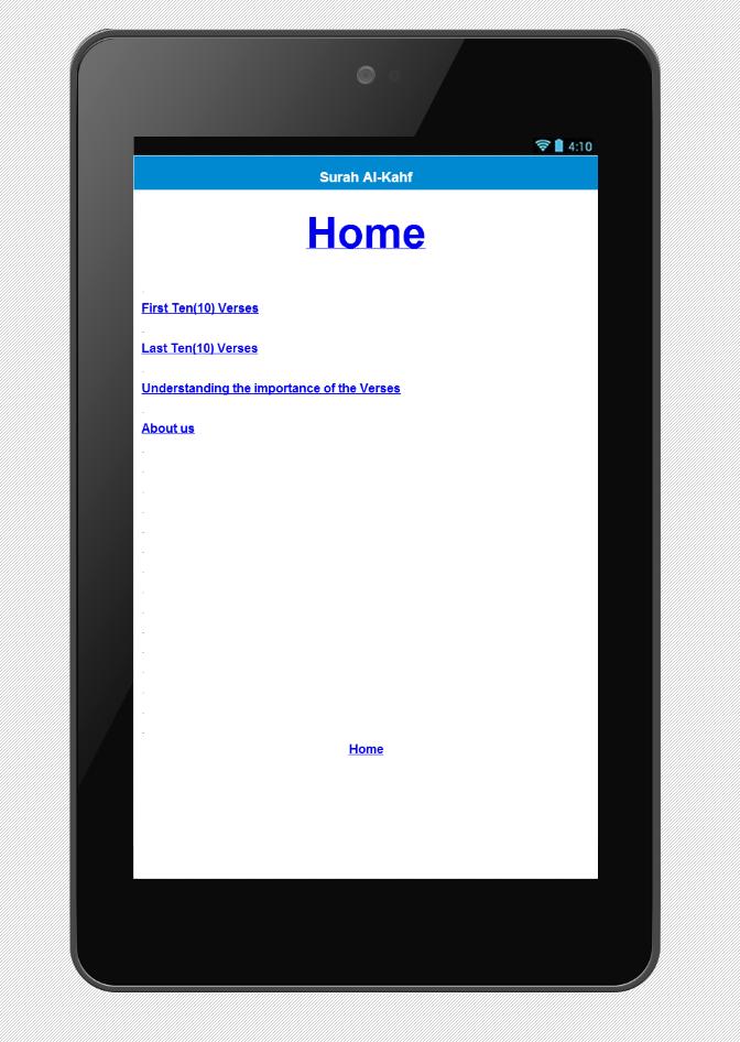 This app includes the first 10 and last 10 verses from Suratal-Kahf (Chapter of the Cave), and some hadith about the surah.