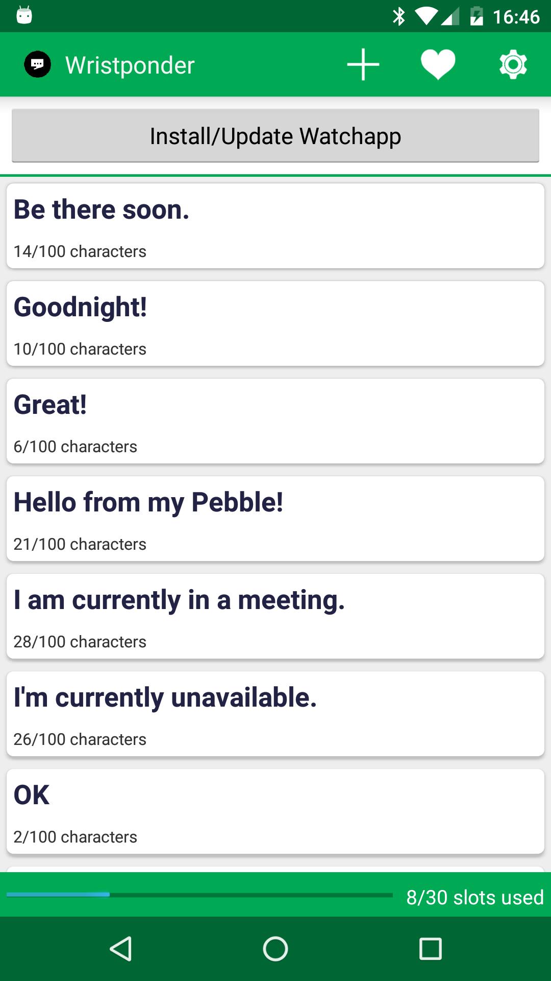 Wristponder lets you send customized pre-set (or 'canned') SMS messages from your Pebble smartwatch! Perfect for times when you need to reply, but it isn't socially acceptable to use your phone.