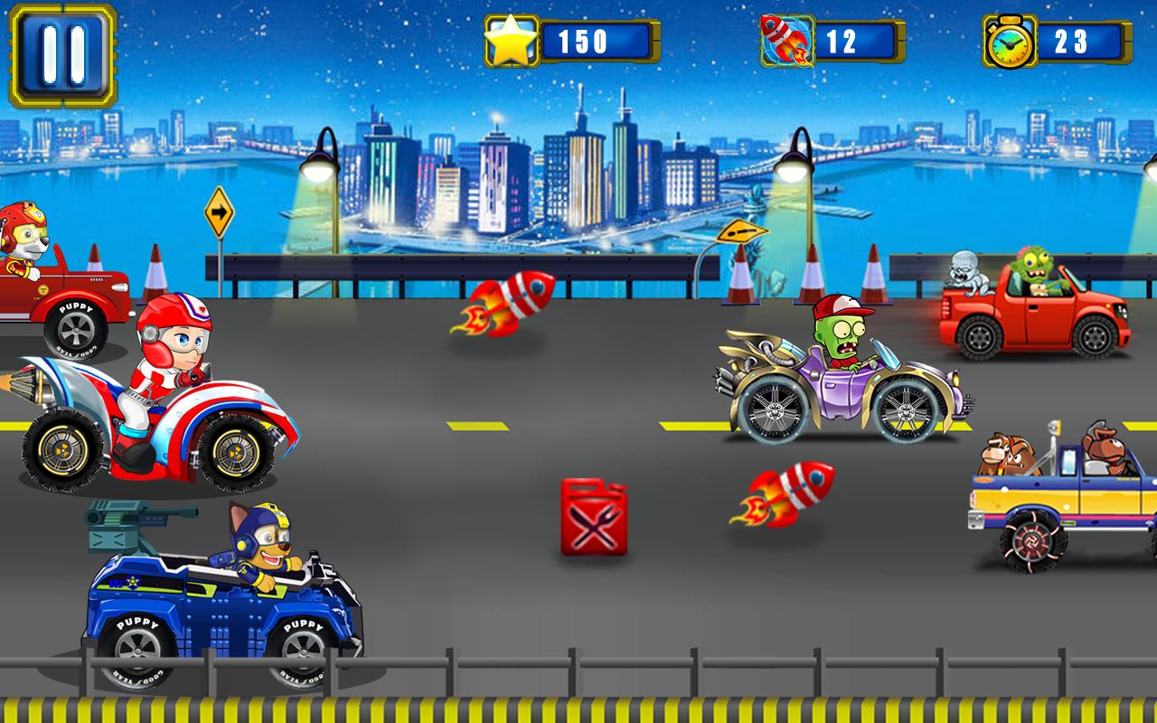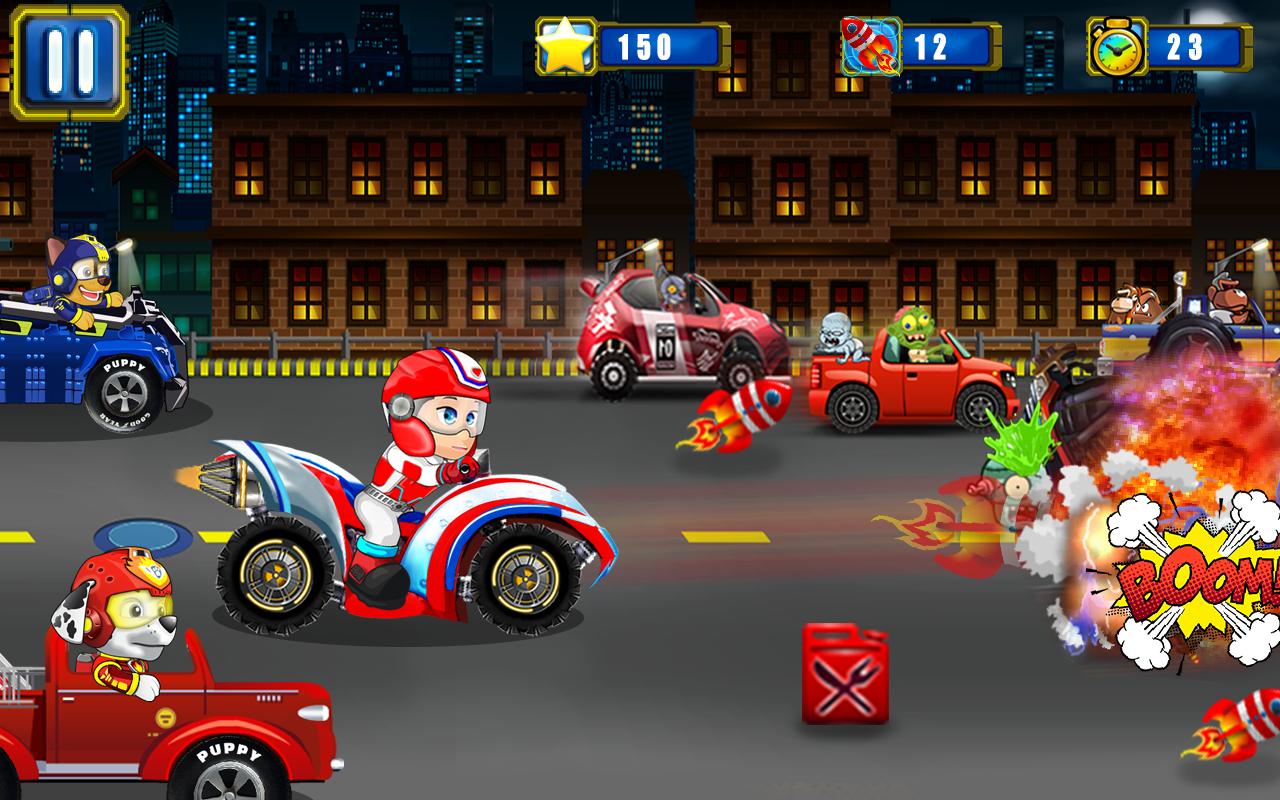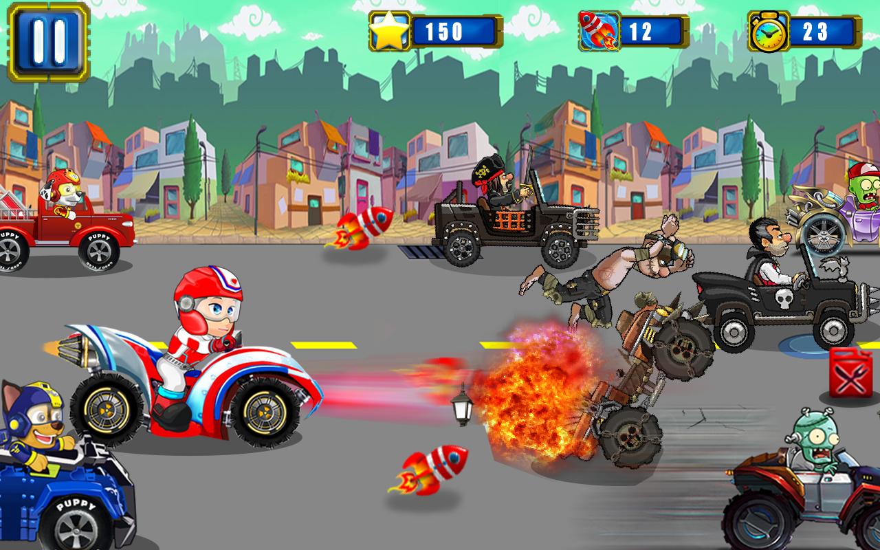 In the game Super Patrol Batle Road, you can plays with the characters ryderes, chasos, and marshooll. You must collect the rocket and destroy the enemies cars.