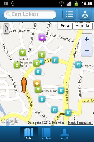 - Peta : Menampilkan lokasi kuliner disekitar anda melalui peta dan daftar nama kuliner. Anda dapat juga mencari lokasi kuliner di tempat lain.
