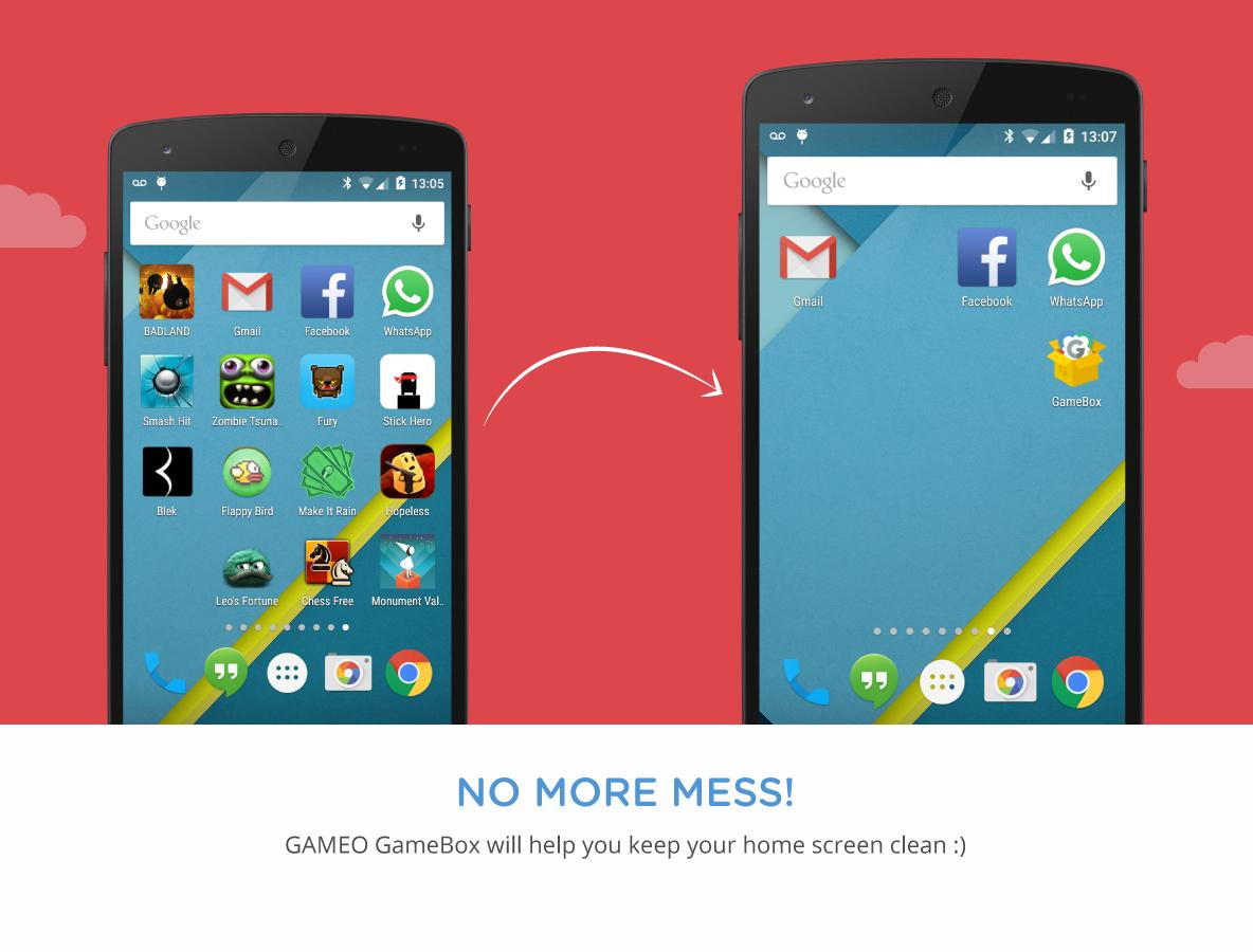 GAMEO GameBox automatically organises your games in an easy to access box, helping you launch games faster and keeping your home screen neater.