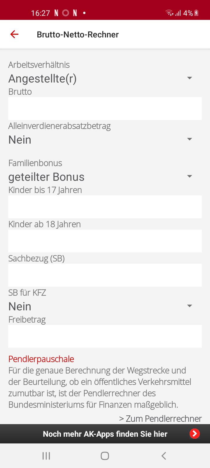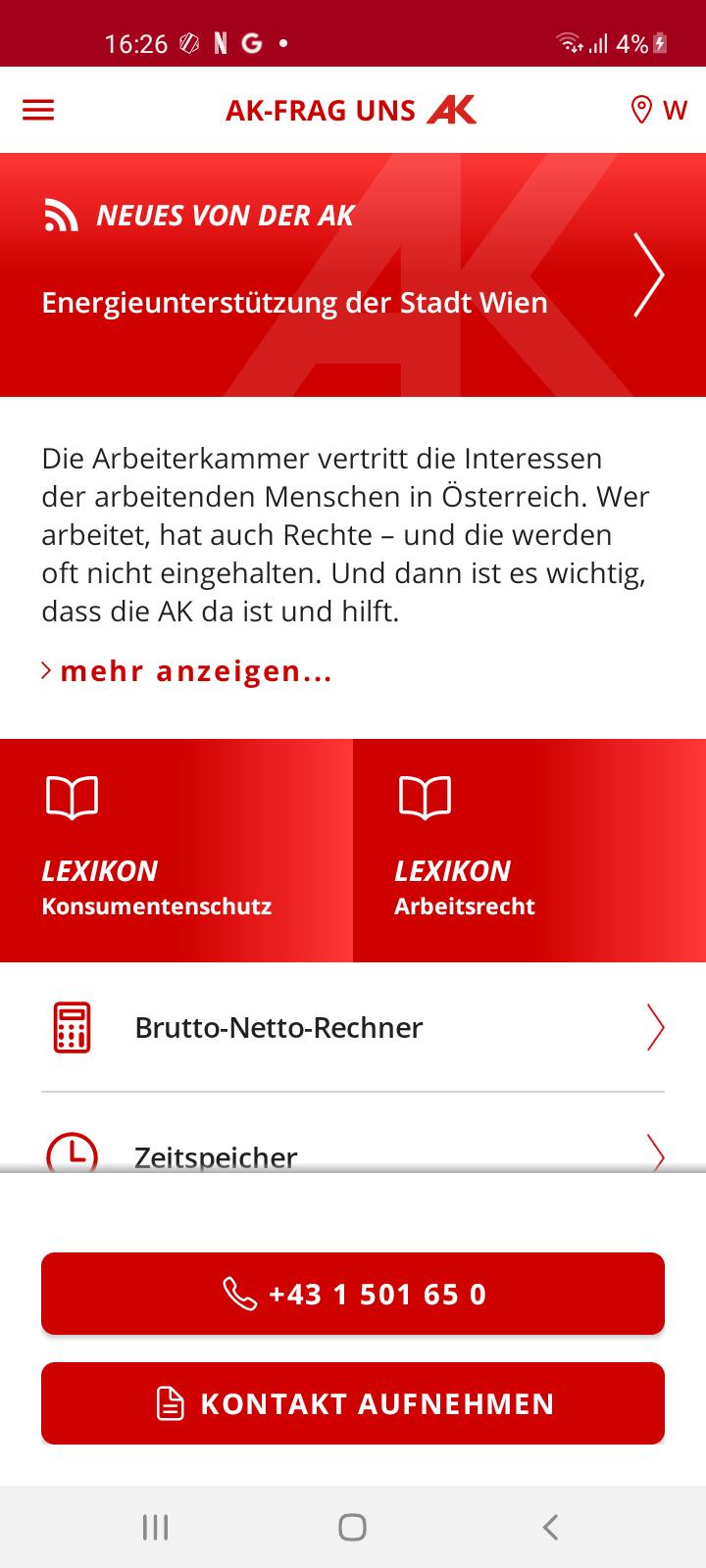 Chamber of Labor services for on the go, e.g. lexicon of labor law and lexicon of consumer protection, gross-net calculator, bank calculator, time memory, AK news feeds, job clips or the AK contact list.