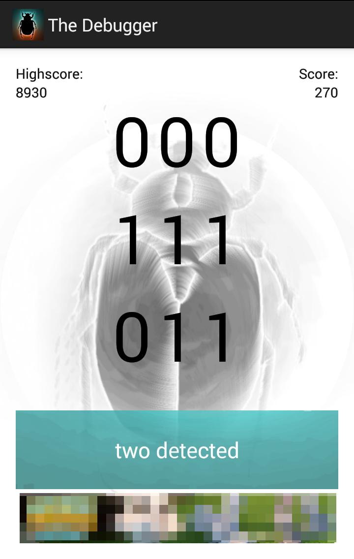 The target of the app is to delete every appearing two (the bug) in the binary-code, while new lines are spawning faster and faster. Through this concept you can prove and train your reaction skills and break your highscore. If this is no callenge for a programmer like you are, there is also a "storm" mode, with fast spawning numbers, letters and symbols. And of course you just must examine also the 2's. The difficulty and speed of this mode lets every racing gaming look old fashioned.