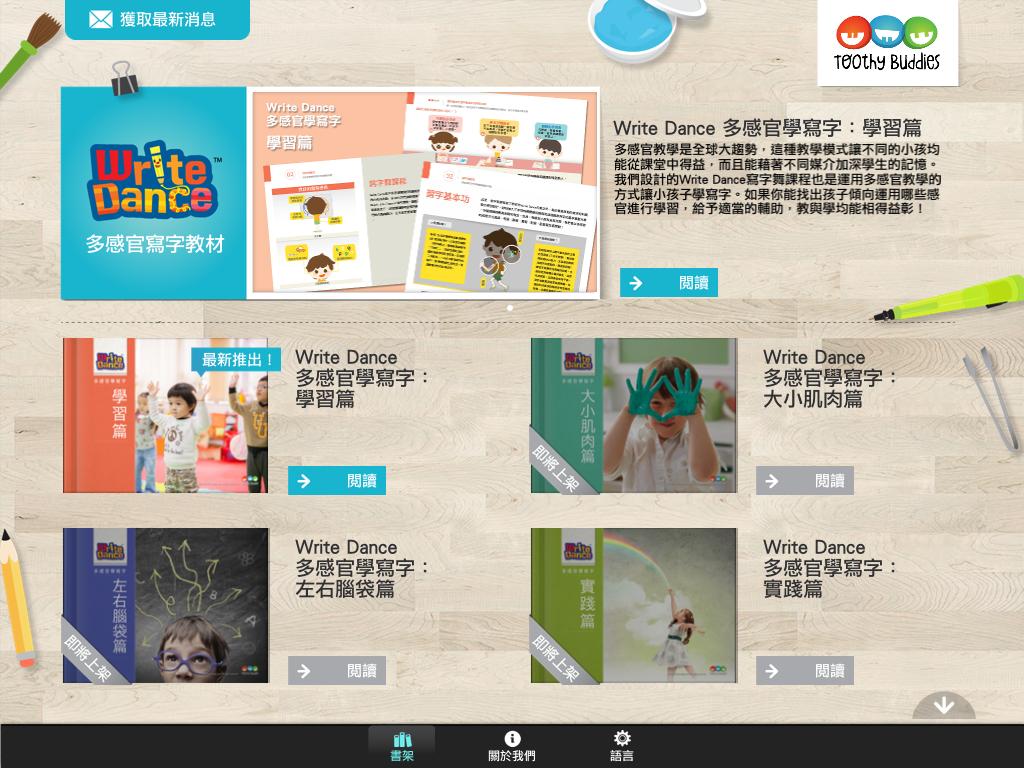 The e-books on bookshelve introduce the idea of Write Dance and related teaching principle to parents and teachers. We also include automatic adaptative exercises for home training.