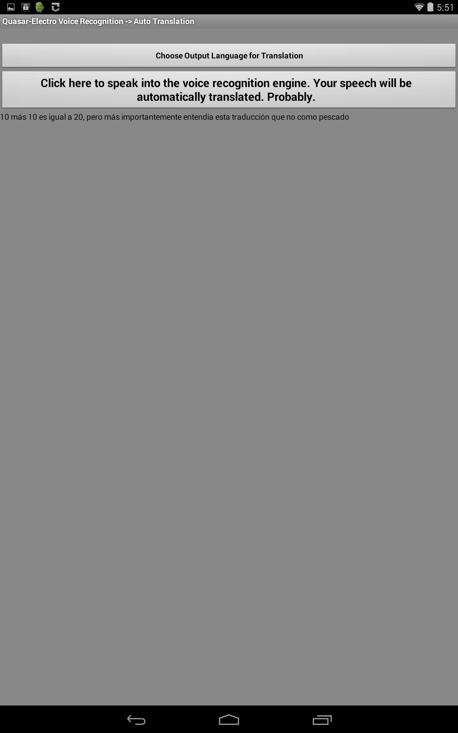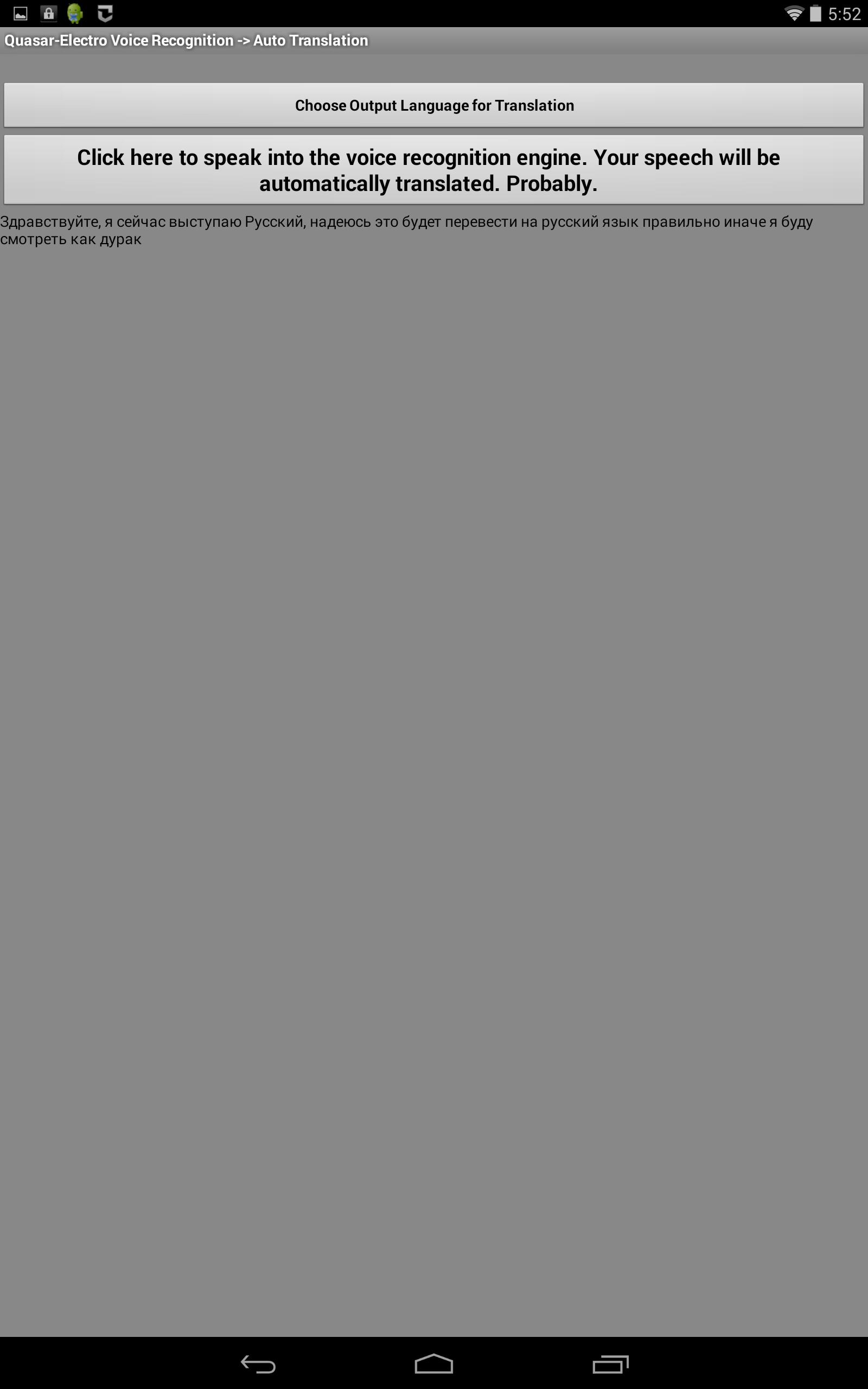 Speak words, phrases, complex sentences, verbose paragraphs, or even long-winded novellas into your android device and this (free!!) app will automatically interpret and translate your speech into both text and speech output. The speech output relies on a state-of-the-art computational linguistics engine, so your translations will be spoken with (mostly) proper pronunciation by the loyal and benevolent robot. This app currently supports translation (text and speech output) to the following languages: