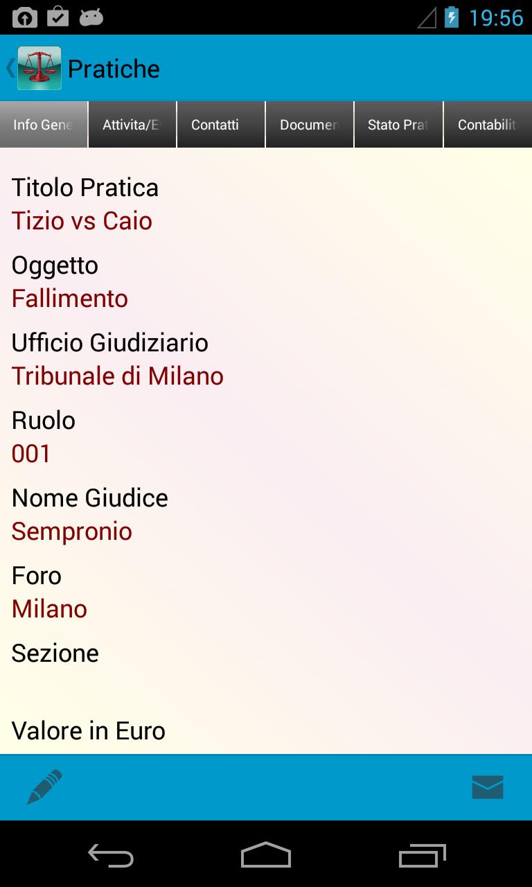 • Practical archive: Insert, modify or delete the practices you deal with. Through the "Mail" button it is possible to send the summary of the practice (general info, practical state) to an email address. In each practice you can insert