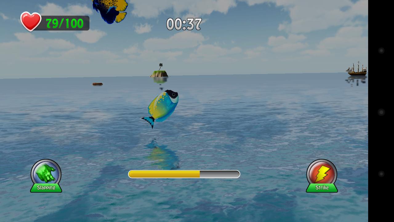 Stickman pi is traveling on the ocean.The ocean is a very dangerous place,so stickman pi must keep awake all the time.Stickman pi can slap or strike himself to keep awake.Stickman pi have 100 health point,slap and strike will cast his hp.If the hp is less than 0,stickman pi will be dead.Fortunately food can be found in the ocean, the banana and the cake can recover stickman pi's hp.The ocean not only has food,but also has dangerous animals,so be careful.