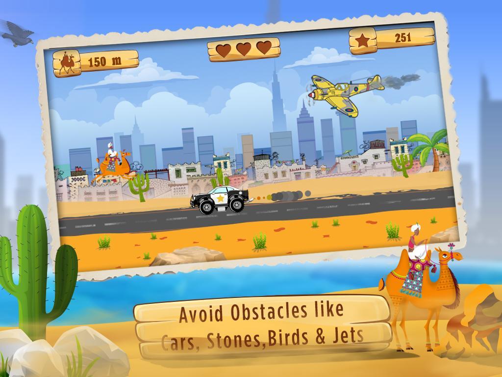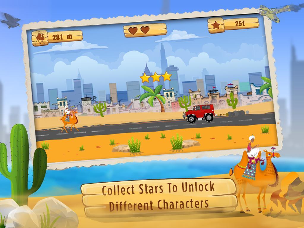Dubai Camel Rider is an action-packed arcade game. Choose your favorite rider & travel across the scenic landscapes of UAE, with famous Burj Khalifa in the background. Drift through traffic like DXB Police, 4x4 Racing Cars & Fighter Jets. Survive the sandstorms & score higher with the help of awesome power-ups. It's time for some dune bashing in Dubai!
