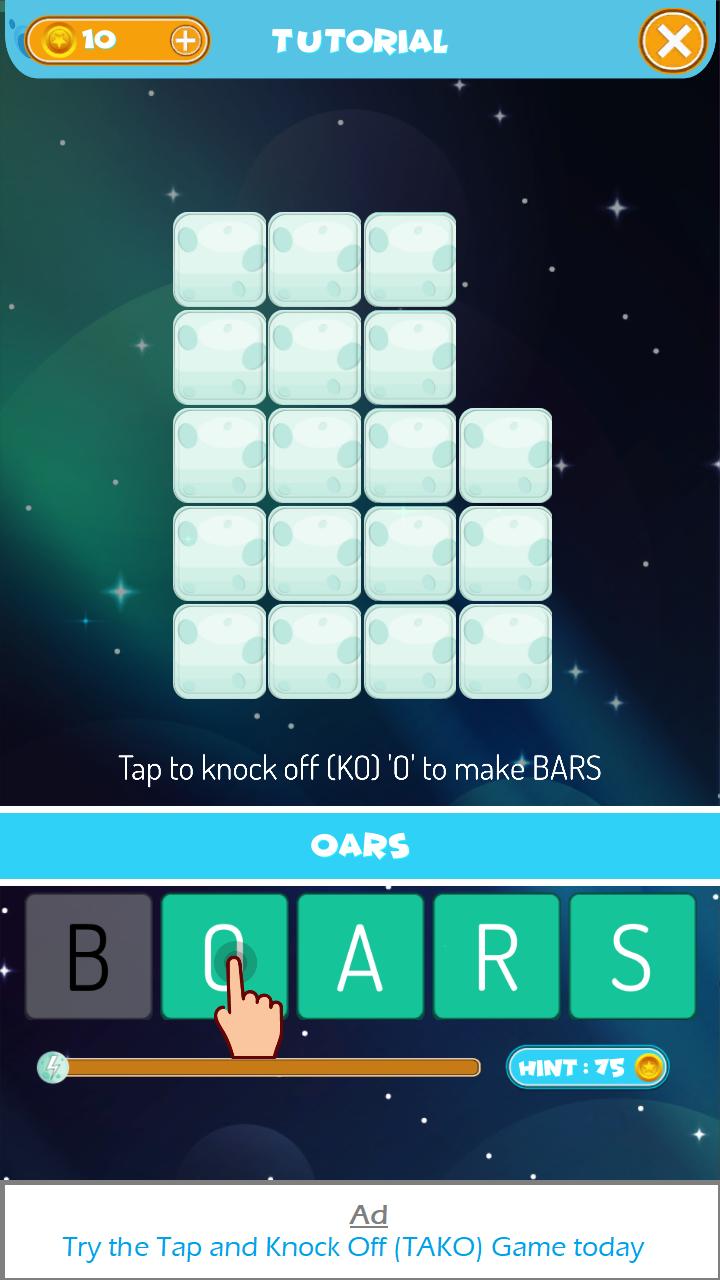 The Tap And Knock Off (TAKO) - Series 5 game is all about words. The goal of the game is to create a set of words from a given word by knocking off letters.