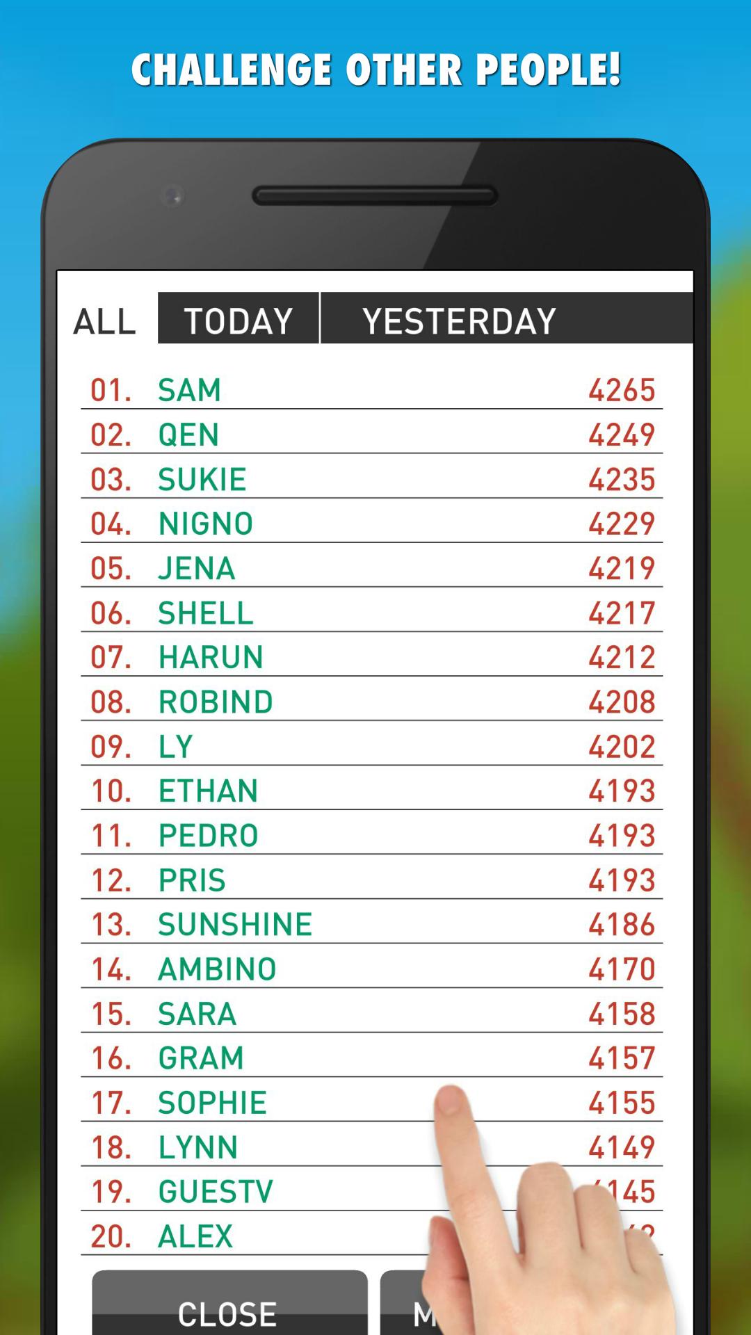 There will be shown a word on the screen, try to remember it as fast as possible and tap when ready (watch out, your points are already running). Then the word will be hidden. Try to answer all 3 questions regarding the word previously shown. Faster you answer the questions, the better score you get! Watch out, you can make max 5 mistakes, otherwise the game ends. Submit your score at the end of the game and review score of other people to see who is the best!