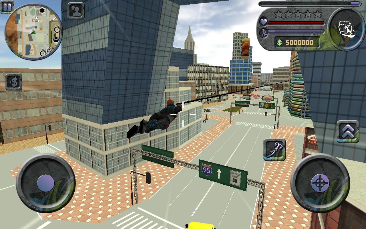 Advanced rope devices on your hands with unlimited charges will help you to travel fast around the town, just swing and throw the rope! Climb the building with a special staff covered gloves! Use different weapons to kill endless enemies, from spider web pistol to bazooka!