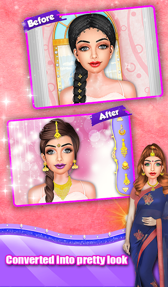 And then visit Indian makeup room and help her to select attractive makeup accessories like an eye lens, eyebrows, hairstyle, eye shadow, blush, lipstick, mascaras, nail paint and much more. After that, it's time to choose an Indian dress up for her like a traditional Indian saree, necklace, earrings, bindi and much more. At the end, don't forget to take an amazing Indian wedding photo and save it into phone gallery. With this Indian makeover game, you can learn makeup for Indian skin and Indian women.