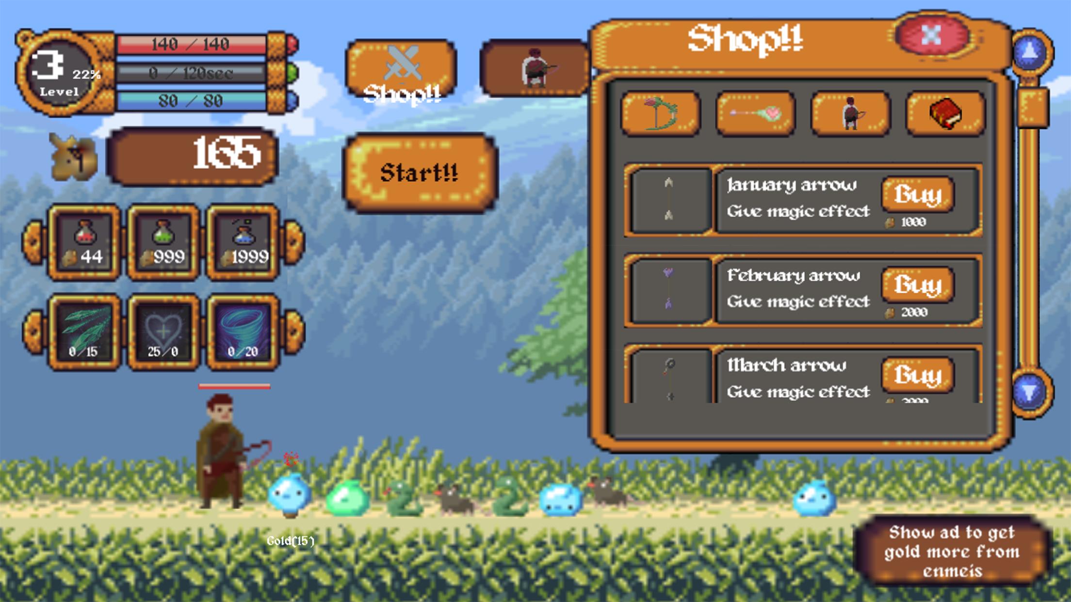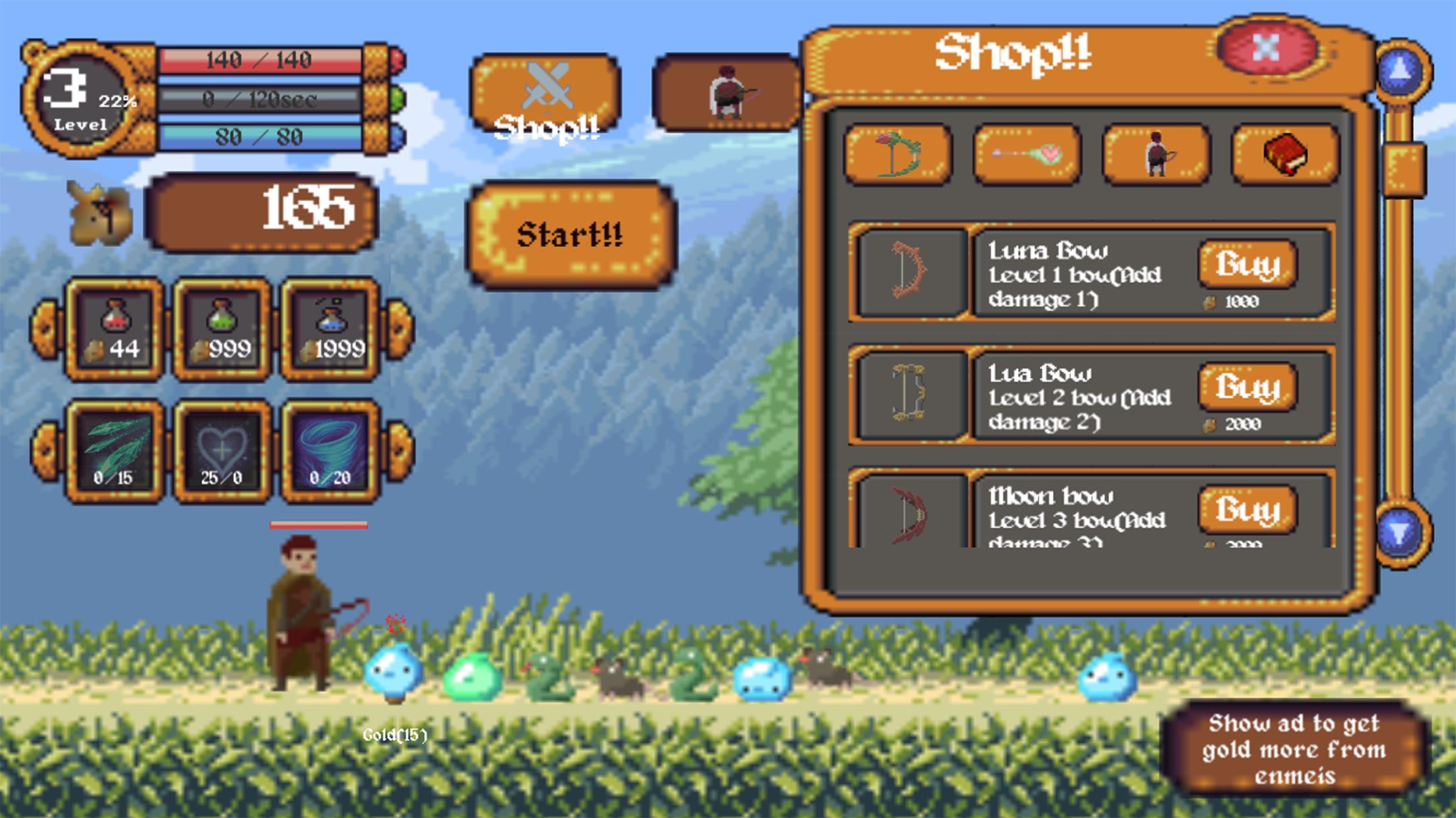 3. Collect gold and try out the store(bows, arrows, transforms)