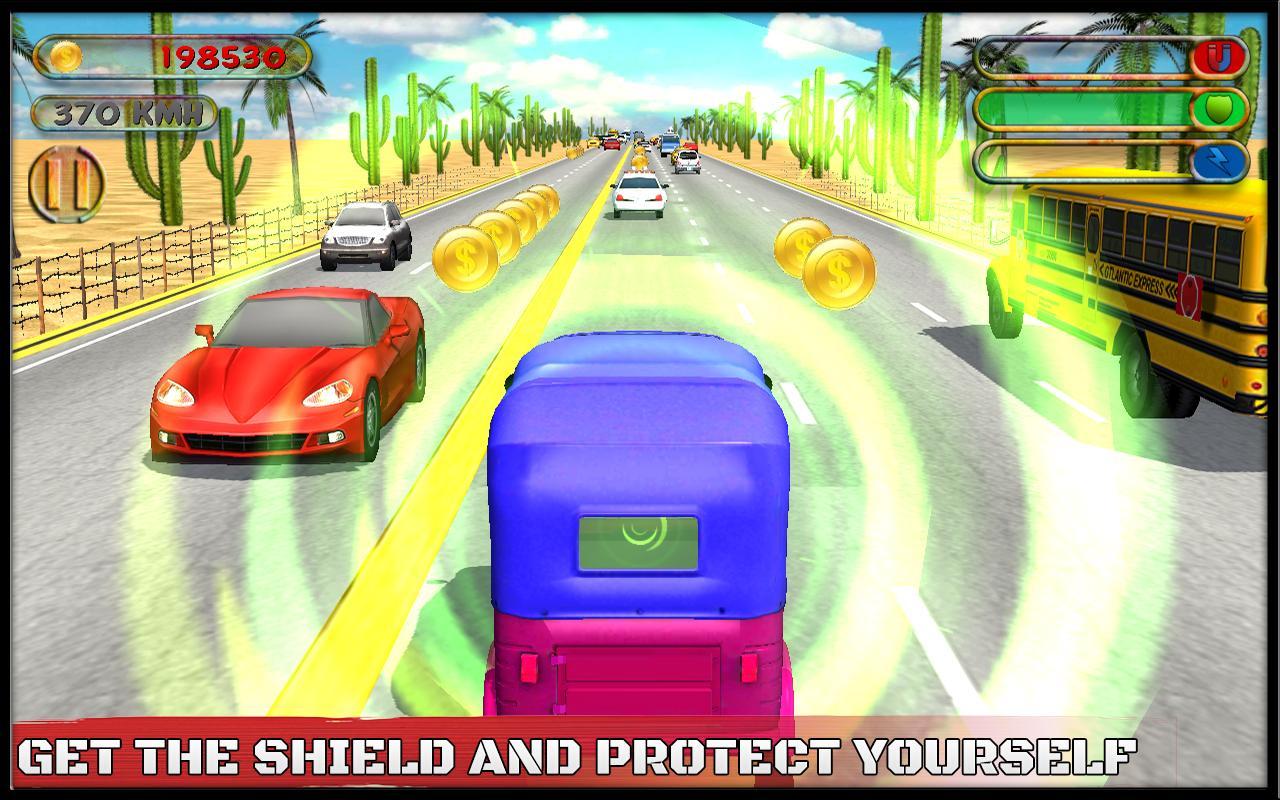 Endless traffic rickshaw racing doesn't only has a variety of auto traffic rickshaw but also has a tender environment. Select your favorite environment to drive among extreme summer desert, a snowy freezing roads, a big green city or a high traffic modern city to win this racing game. Drive rickshaw throughout the high traffic city and collect power ups to enhance health of your traffic rickshaw. Use electrifying magnet power to pull more and more coins towards your endless traffic rickshaw. You can also protect rickshaw from a city traffic cars or traffic by protecting shield. A boosting speed engine help you to drive fast and add a thrill of extreme excitement in your endless traffic rickshaw racing tour. Let's download this free game today to get connect with your friends and show them to your driving skills by winning rickshaw race.