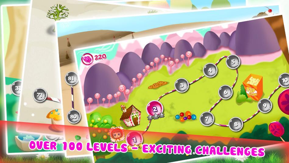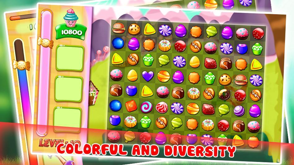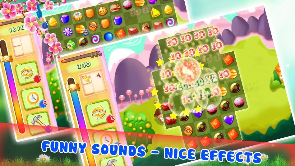 - Collect special candies: more playing time, swapped candies, or automatically break the 3 pairs same.