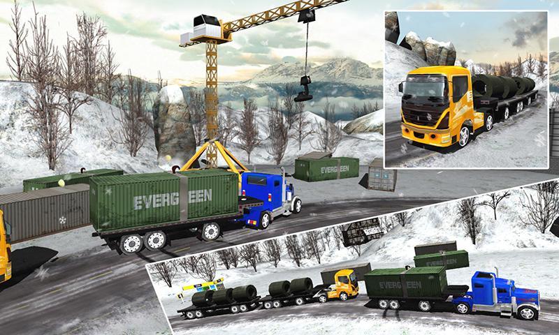 Use cranes, drive transporter truck, passenger bus and racing cars on snowy road