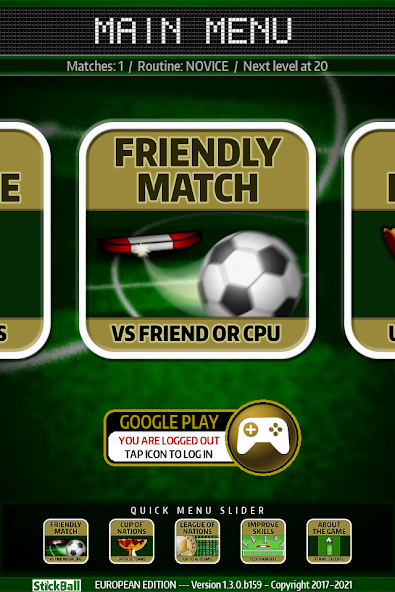 - FRIENDLY MATCHES against another PLAYER or CPU with optional extra time and penalty shootout.