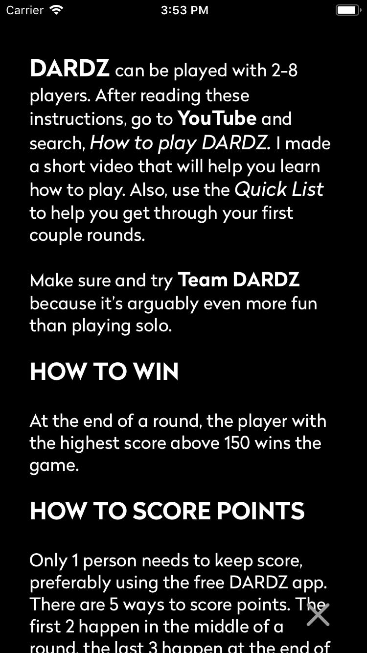 DARDZ هي لعبة تستخدم Dice + Cards. إنه حظ في الغالب بلمسة من الاستراتيجية. يتزوج التطبيق مع اللعبة لجعل الحفاظ على النتيجة أسهل بكثير.