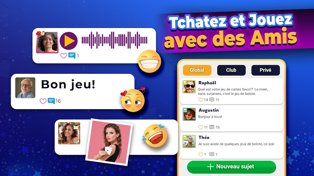 إنشاء أو الانضمام إلى نادي اجتماعي أو قتال! كن قائدًا ، ودعوة أصدقائك ، وعب لعبة Belote مجانية وكسب تجربة النادي. مستوى أعلى ناديك!