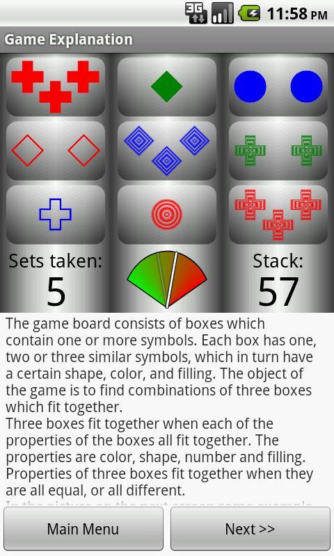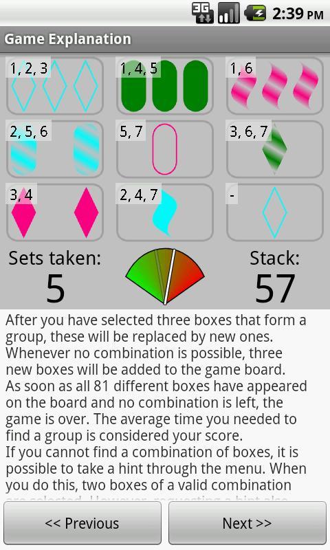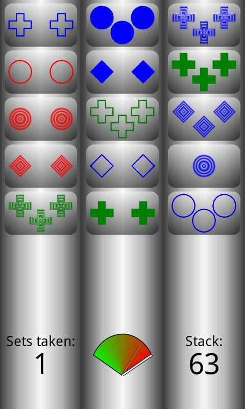 في لعبة ألغاز اللاعب الفردي هذه ، يستخدم اللاعب التعرف على الأنماط لإيجاد مجموعات من الرموز التي تنتمي معًا. تعتمد اللعبة على لعبة تسمى Set ، والتي صممها مارشا فالكو في عام 1974.