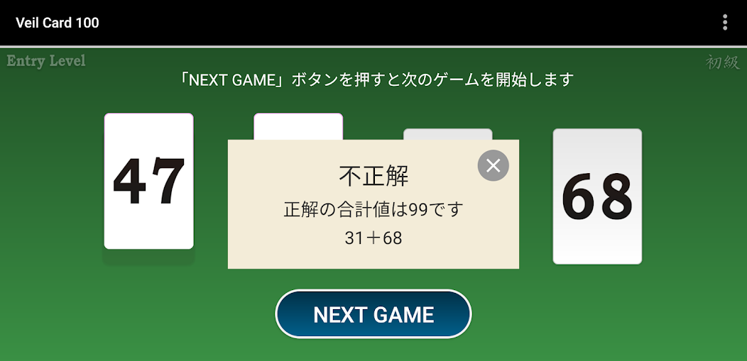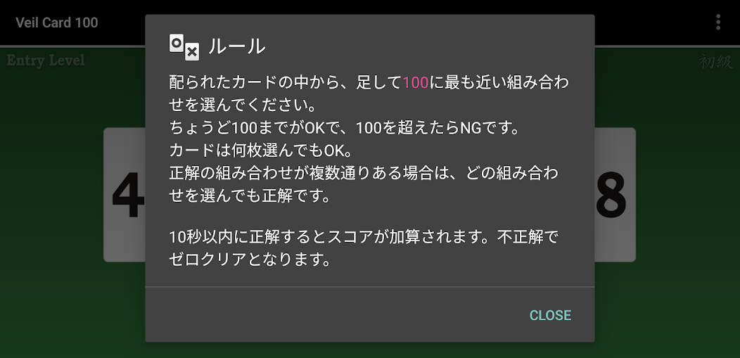 قم بتفعيل عقلك بلعبة بسيطة! ما عليك سوى اختيار بطاقة مع ما مجموعه 100 من أربع بطاقات مع أرقام مكونة من رقمين مكتوبة عليها. إذا تجاوز 100 ، فهو نانوغرام.
