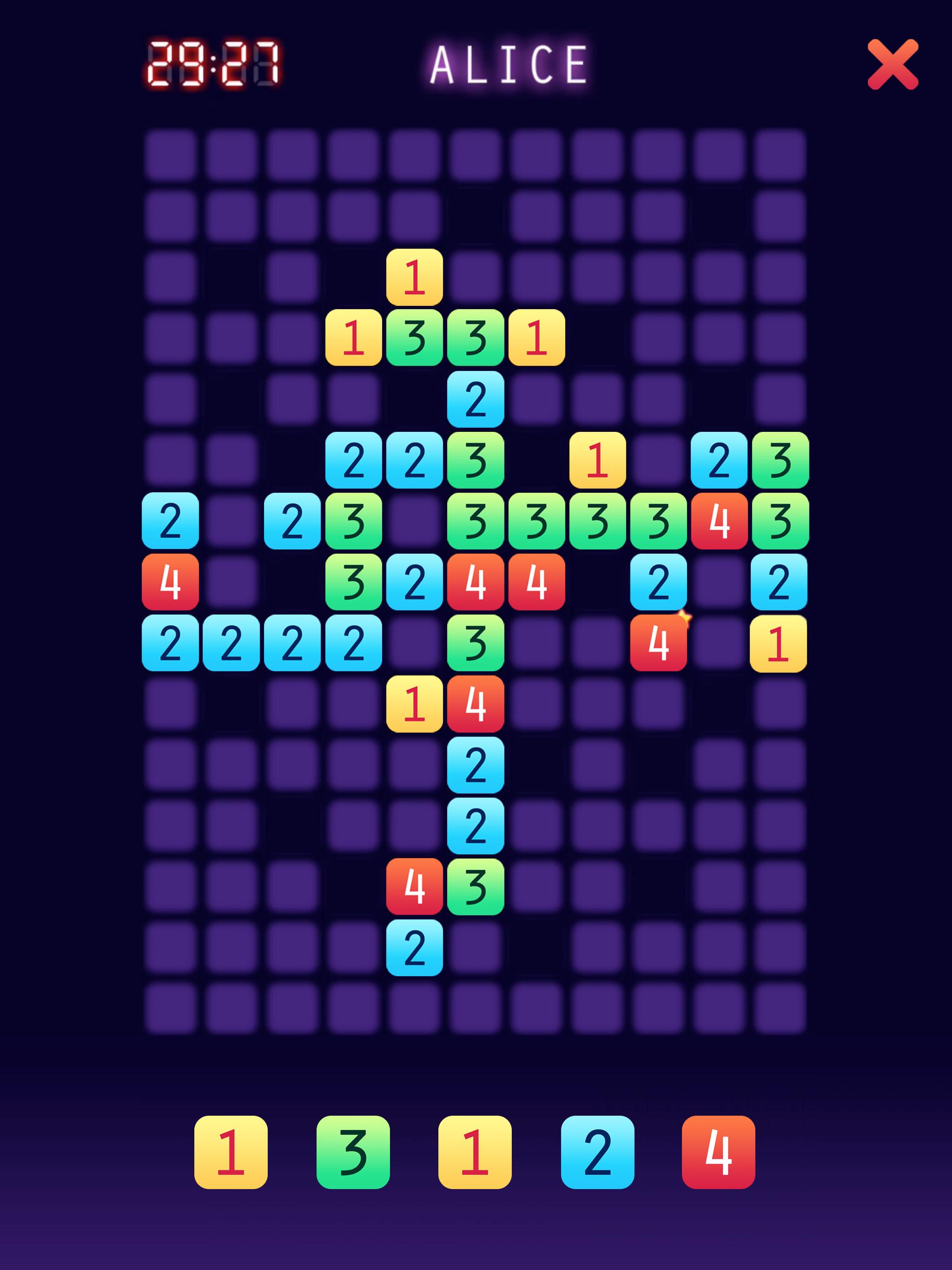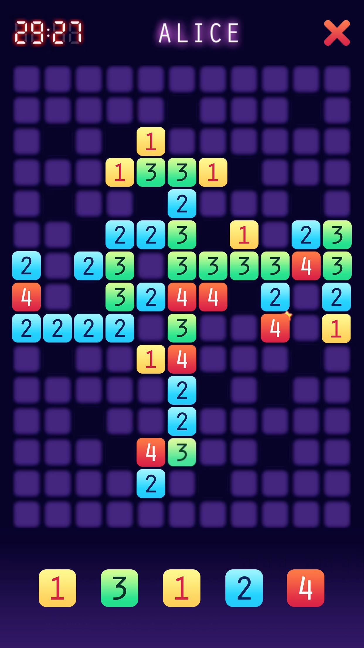 ابدأ بلوحة بها 145 مربعًا للعب ، و 20 حفرة سوداء ورقم 4 في المركز. يمكنك الحصول على خمس قطع عشوائية ، مرقمة من 1 إلى 4 تخبرك عدد الجوانب التي يمكنك الاتصال بها بقطعة أخرى. خذ دورك لوضع قطعتك في وضع مع العدد الصحيح من الاتصالات إلى قطع أخرى. لديك 30 ثانية اتخاذ خطوة. يتم استبدال كل قطعة لعبت بواحدة جديدة عشوائية. ضع آخر قطعة ممكنة على السبورة للفوز.