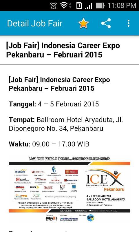 Aquí puede obtener un calendario de eventos de feria de trabajo o intercambios de trabajo en varias ciudades de Indonesia, como Job Fair Yakarta, Job Fair Bandung, Depok Job Fair, Tangerang Job Fair, Bekasi Job Fair, Bogor Fair, Job Fair Yogyakarta, Job Fair Semarang, Job Fair Surabaya, Job LA Medan, Feria de Job, Feria, Job Fair Palembang, Job Fair Lampung y otros