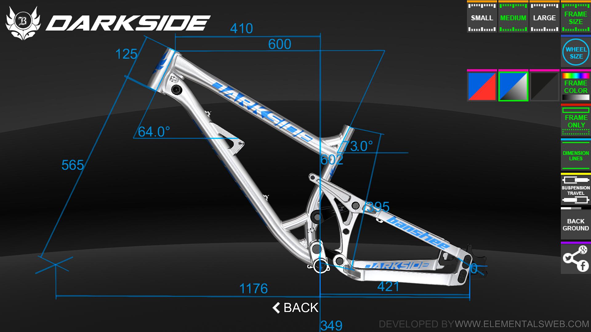 Banshee Bikes Virtual 3D - es una aplicación de demostración de productos para dispositivos móviles. Con la tecnología moderna y los gráficos 3D, puede ver el producto directamente desde su dispositivo móvil, cambiar los colores del marco, el tamaño, el tamaño de la rueda, consulte cómo funciona la suspensión con las dimensiones reales. Banshee Bikes Virtual 3D también disponible en la página web de Banshee Bikes. Si desea obtener más información sobre un modelo específico, consulte las áreas técnicas en la página de cada modelo de bicicleta.