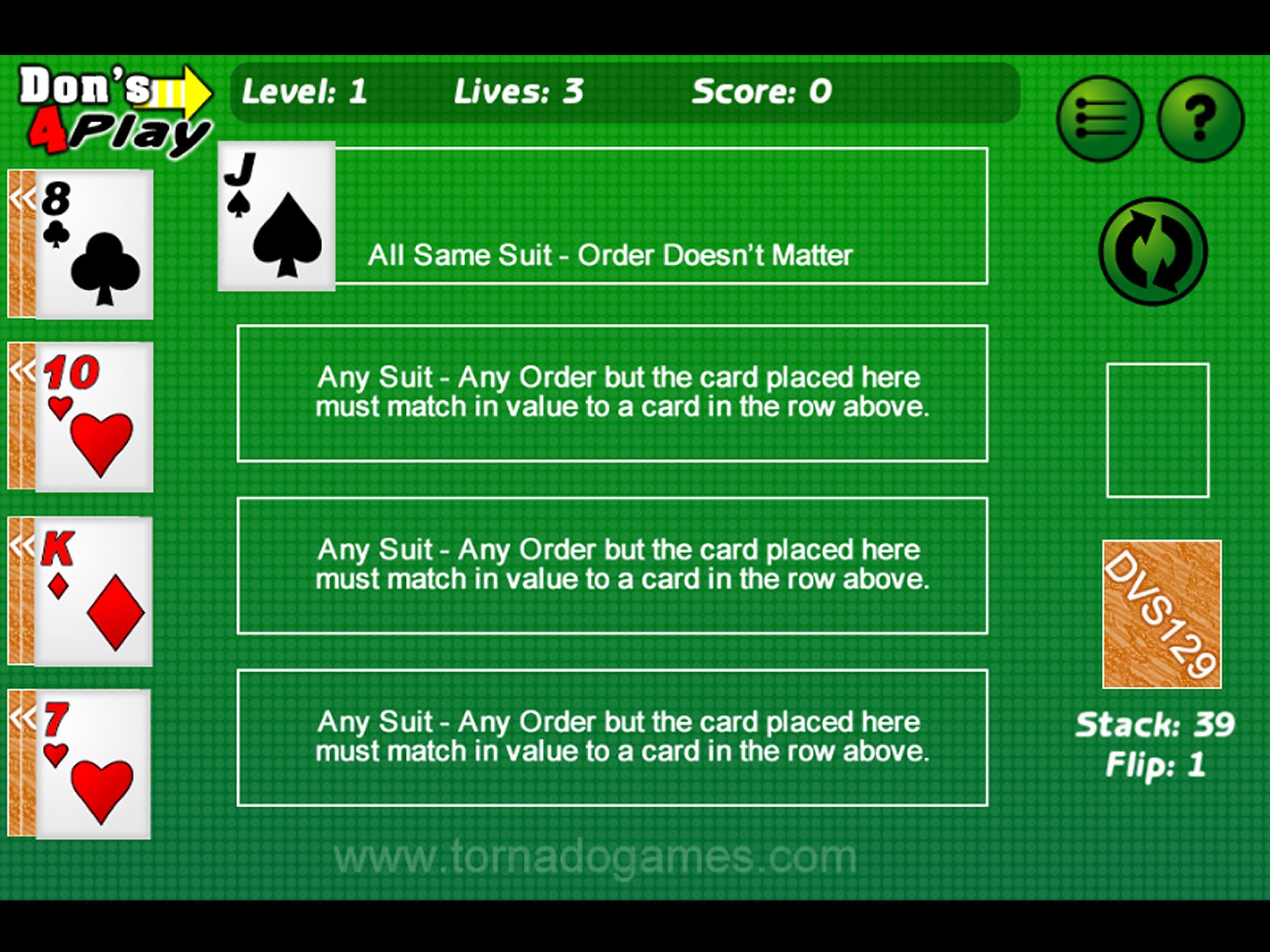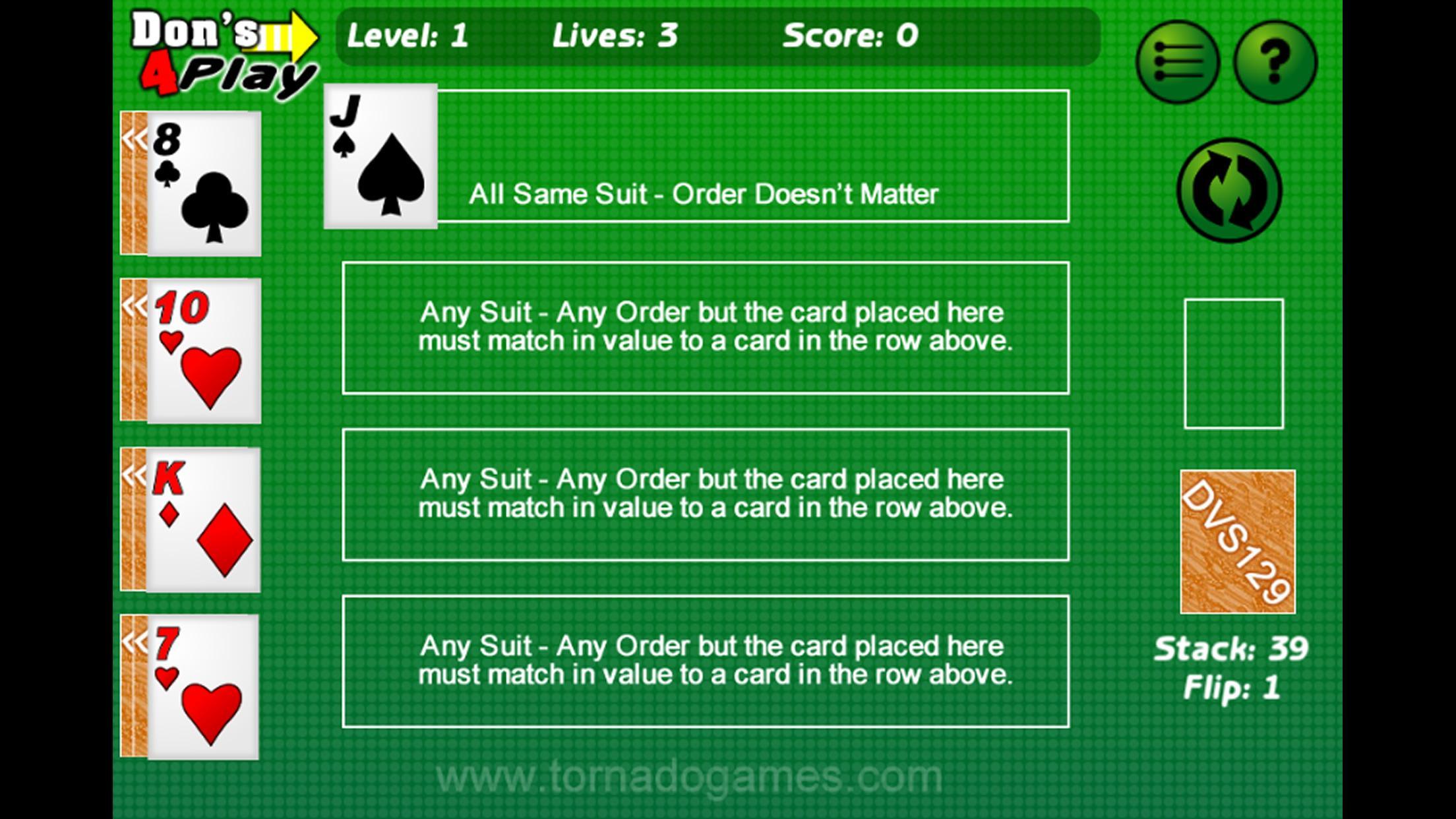 Don's 4 Play es un juego de cartas solitario. El objeto es apilar la plataforma en hileras de trajes coincidentes. El pedido de las tarjetas no importa. Solo puede colocar tarjetas en una fila a continuación si ese valor de la tarjeta está presente en la fila de arriba. Sé que suena confuso, pero hay instrucciones en el juego que te ayudarán a comprender. Cada nivel se vuelve un poco más difícil, así que prepárate y ponte tu límite de pensamiento.